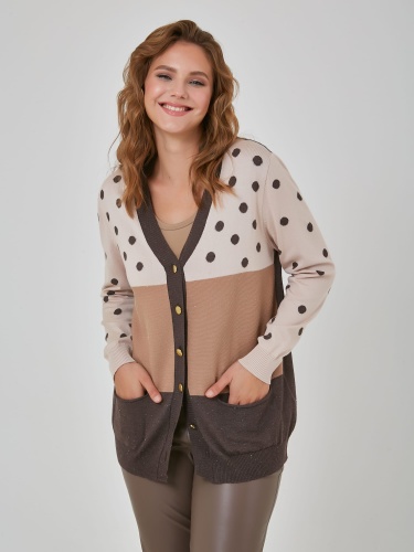 Уютный кардиган в теплых кофейных тонах с накладными карманами и широкой резинкой по низу.