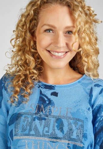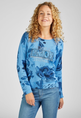 Джемпер с круглым вырезом, стильным закругленным краем и длинными рукавами — незаменимая вещь для каждой следящей за модой женщины! Свитер украшен потрясающим цветочным принтом, привлекающим внимание. В качестве особого акцента искусно вставлены блестящие камни, которые придадут вашему образу гламурный вид. Длина спинки от плеча для 44 размера: 62 см.