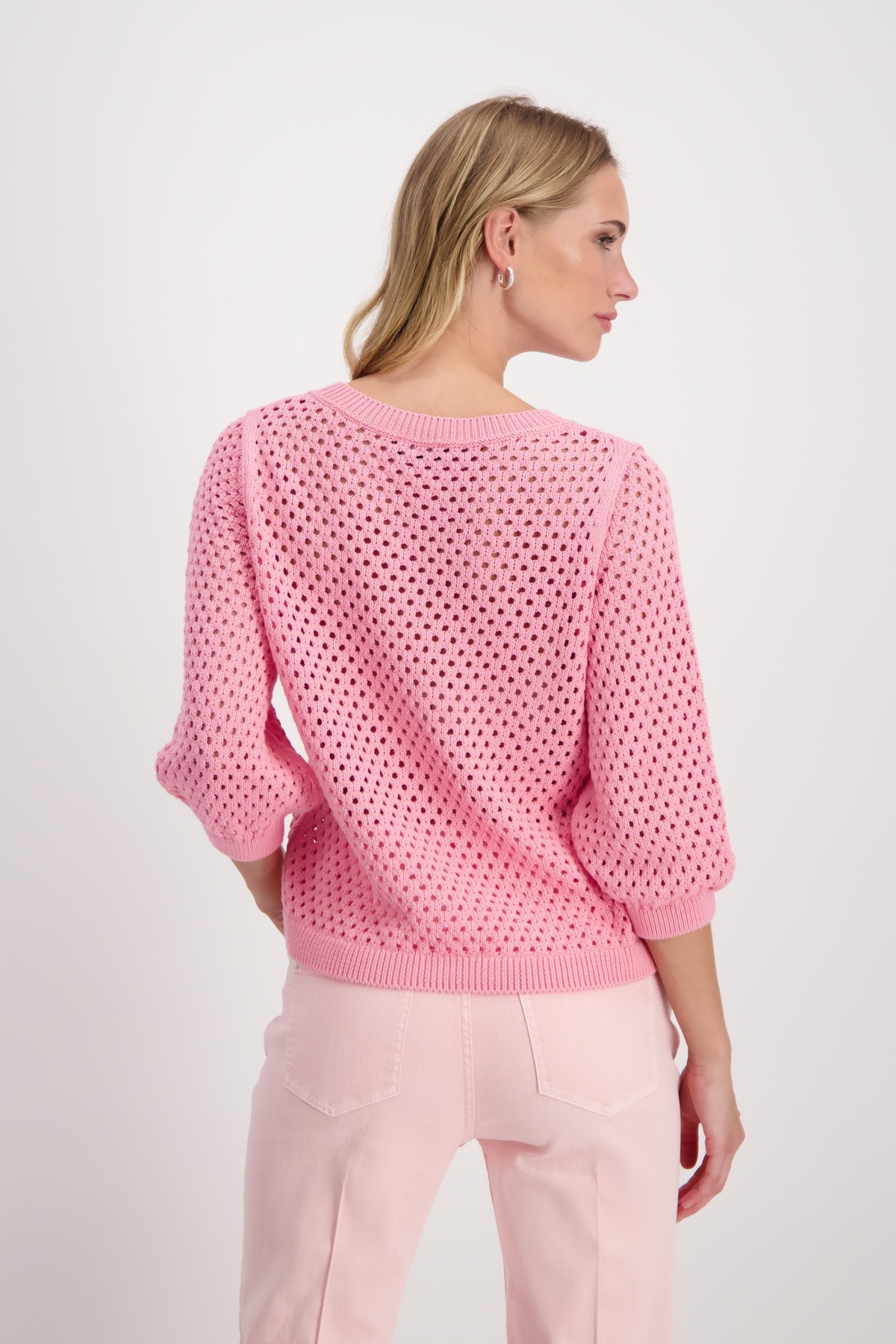 Свитер с рукавами 3/4 выполнен из 100% хлопка и имеет красивый ажурный узор. Регулярная посадка. Ребристый круглый вырез. Ребристые манжеты и подол. Длина 44 размера 56 см.