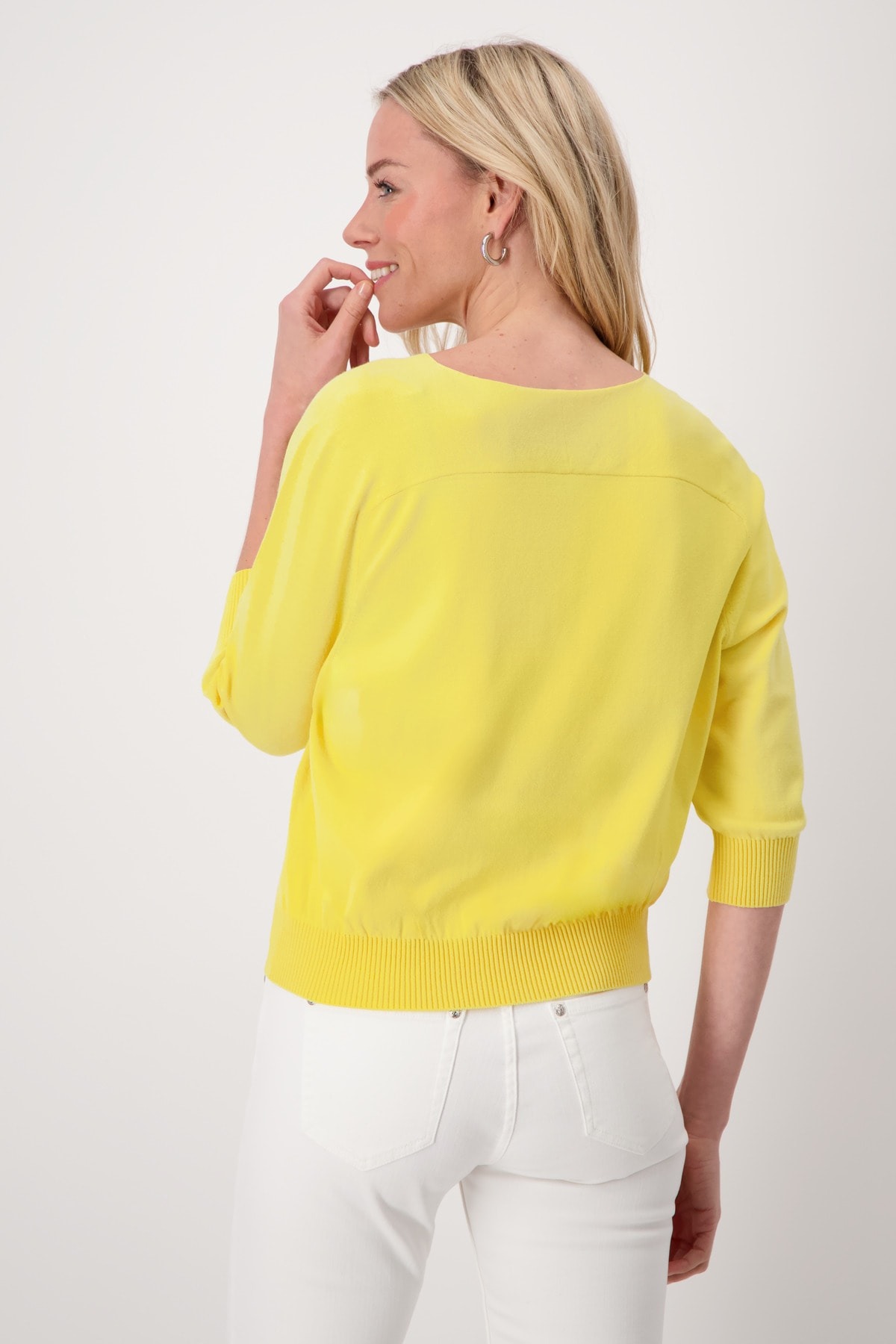 Стильный свитер из струящейся смесовой вискозы с рукавами реглан 3/4 и гладкой структурой. Круглый вырез. Ребристые манжеты и подол. Длина 44 размера — 56 см.