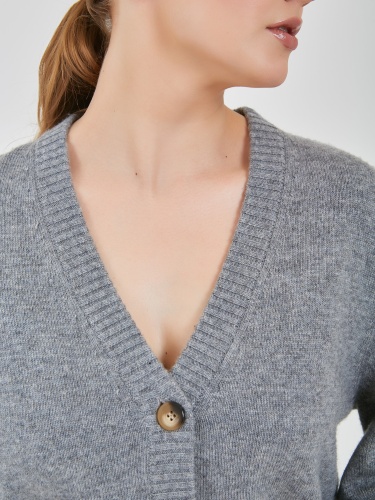 Кардиган в светло-сером цвете с глубоким V-образным вырезом зрительно вытягивает силуэт. Акцентные пугововицы и расширяющийся книзу рукав добавит к образу изюминку.Осень-Зима'25/26. Капсула "Вишневый сад"