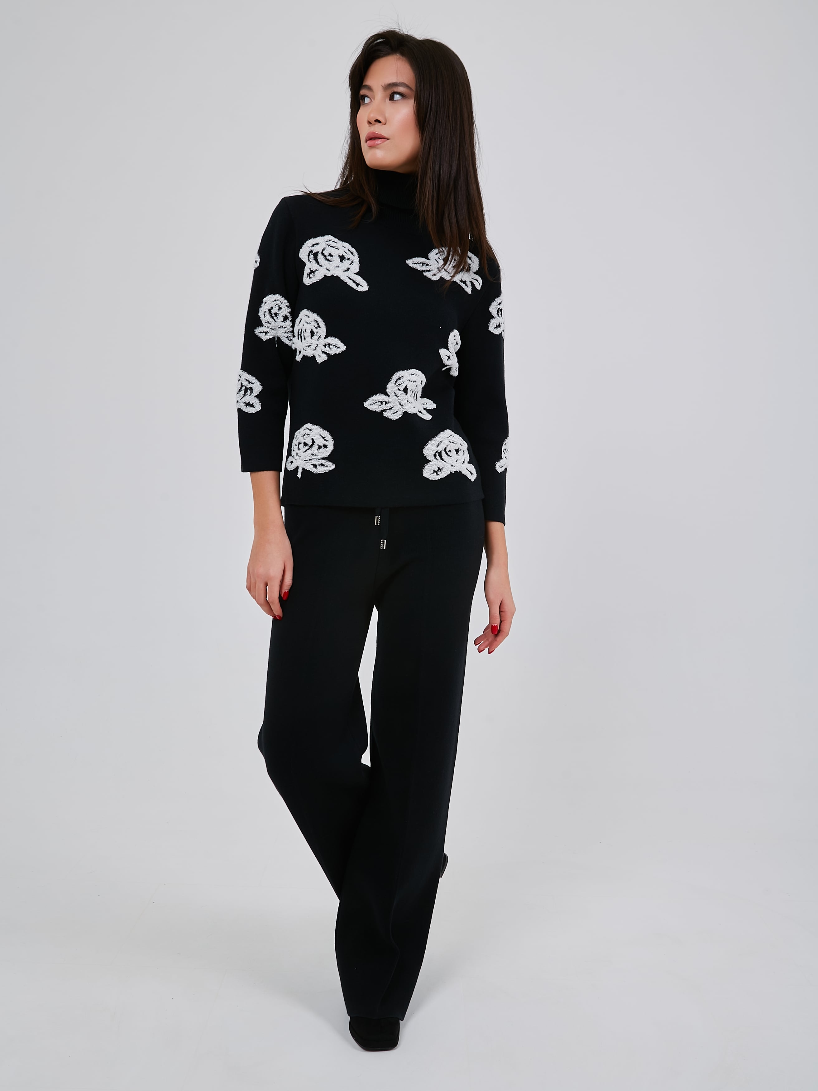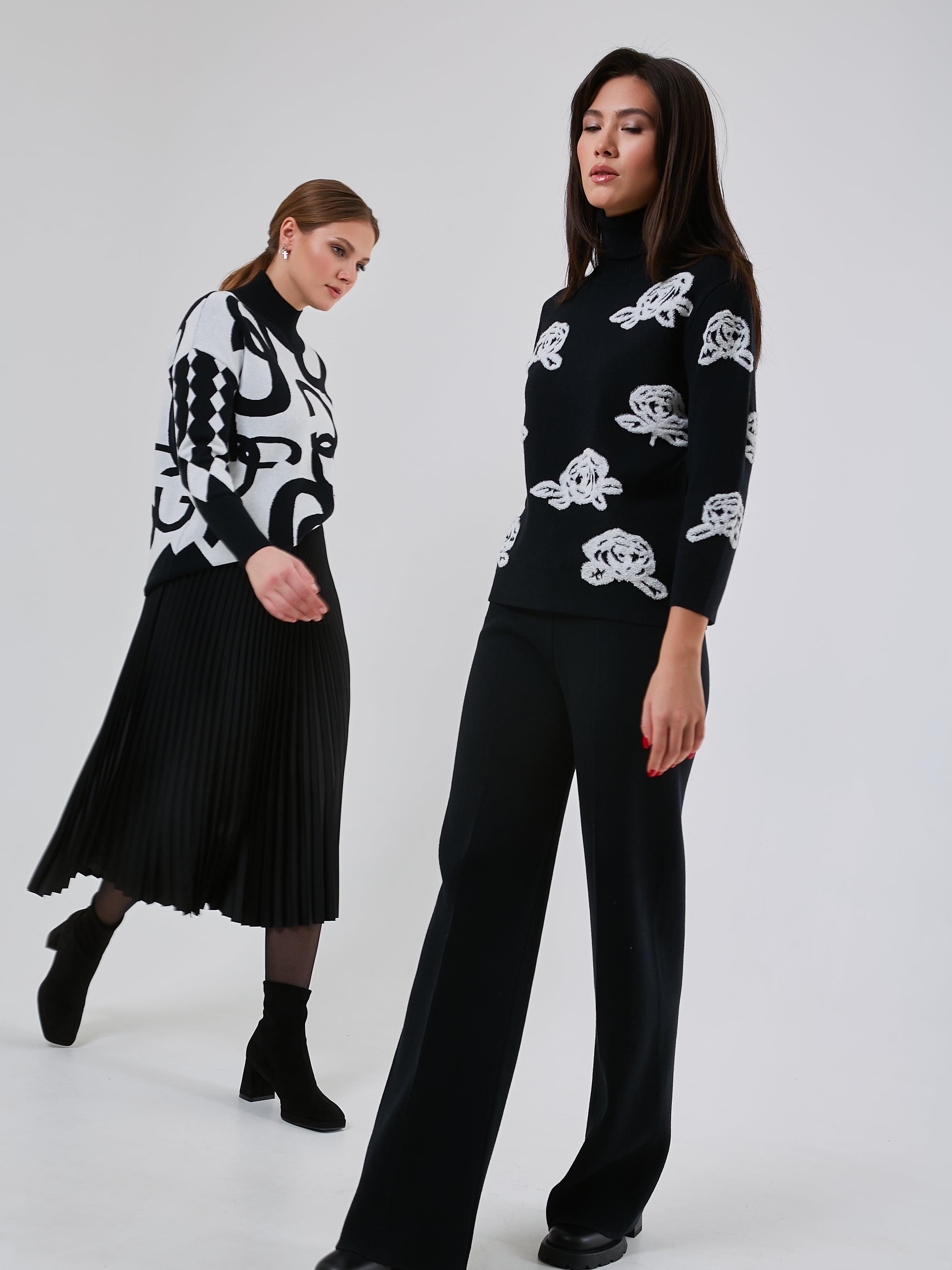 Стильный трикотажный джемпер с чёрно-белым принтом, выполненным в объёмной технике. Осень-Зима'25/26. Капсула "Малахитовая шкатулка"