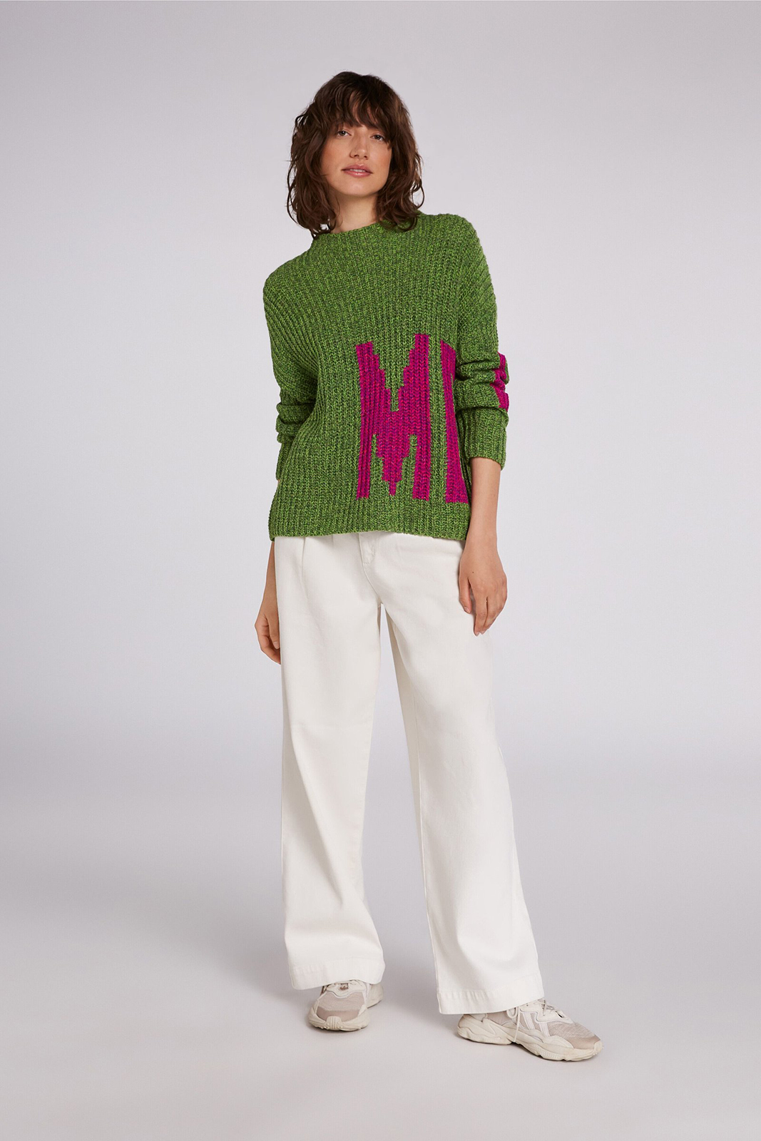 Свитер крупной вязки с оригинально расположенной вязаной надписью "МЕГА" - «ME» спереди, «G» на левой руке, «A» на спине. Стильное цветовое сочетание зеленого и фуксии. Свободный силуэт, короткий воротник-стойка. Длина 50 см для 42 российского размера. Рост модели 178 см, ее размер - 42.