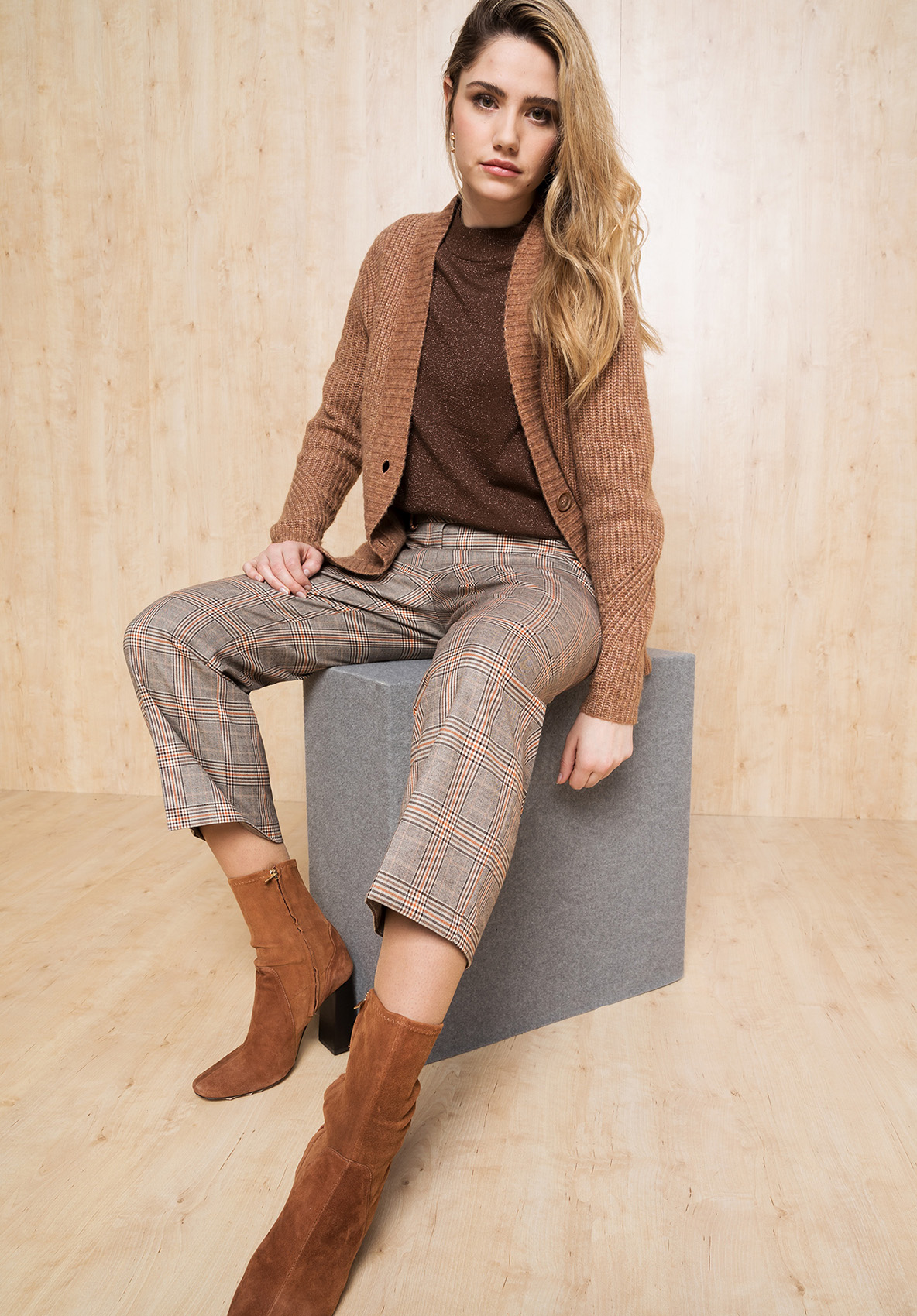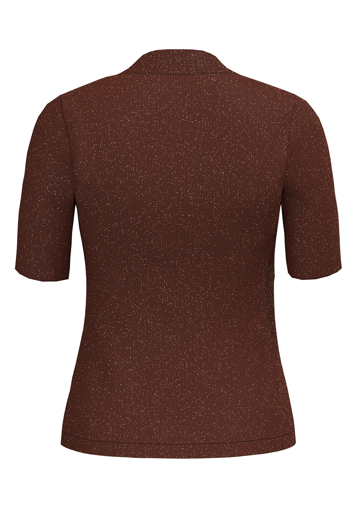 Джемпер прямого покроя с воротником-стойкой и рукавами 1/2 - отличный компаньон для любого образа! Классический цвет кофе поистине универсален и подходит ко всему. Смесовый материал с хлопком комфортен и приятен к телу, а нить люрекса в составе изделия придает легкий блеск.