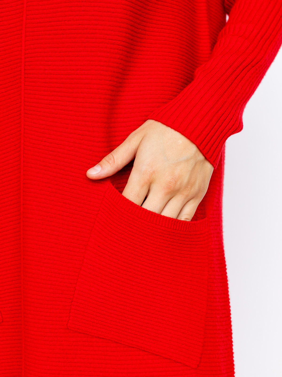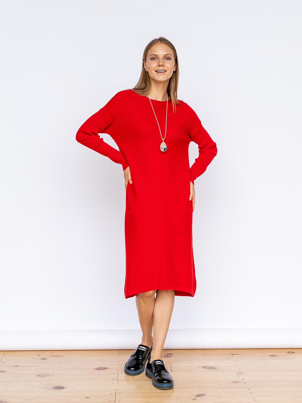 Однотонная трикотажная туника - тренд сезона! Актуальная длина миди и свободный крой идеально подходят под любой тип фигуры. Спереди изделия идет декоративный шов. Вырез горловины лодочка выгодно подчеркивает линию шеи. Спущенная линия плеч делает образ расслабленным. Два практичных накладных кармана спереди создают динамику в фактуре изделия.
