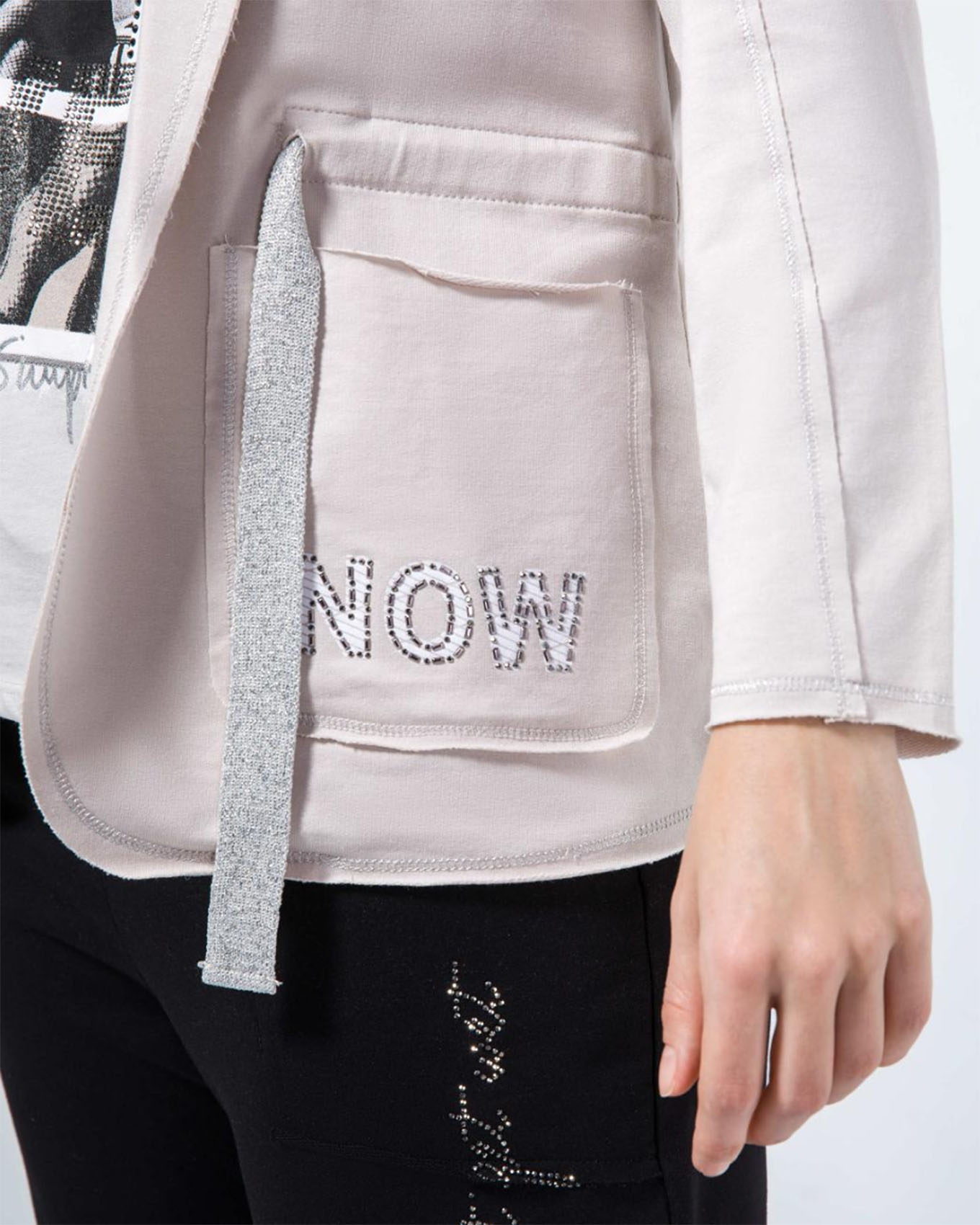 Кардиган песочного цвета. Отложной воротник, кулиска на талии, накладные карманы. Стальный декор из страз. Открытые срезы изделия создают демократичный образ.