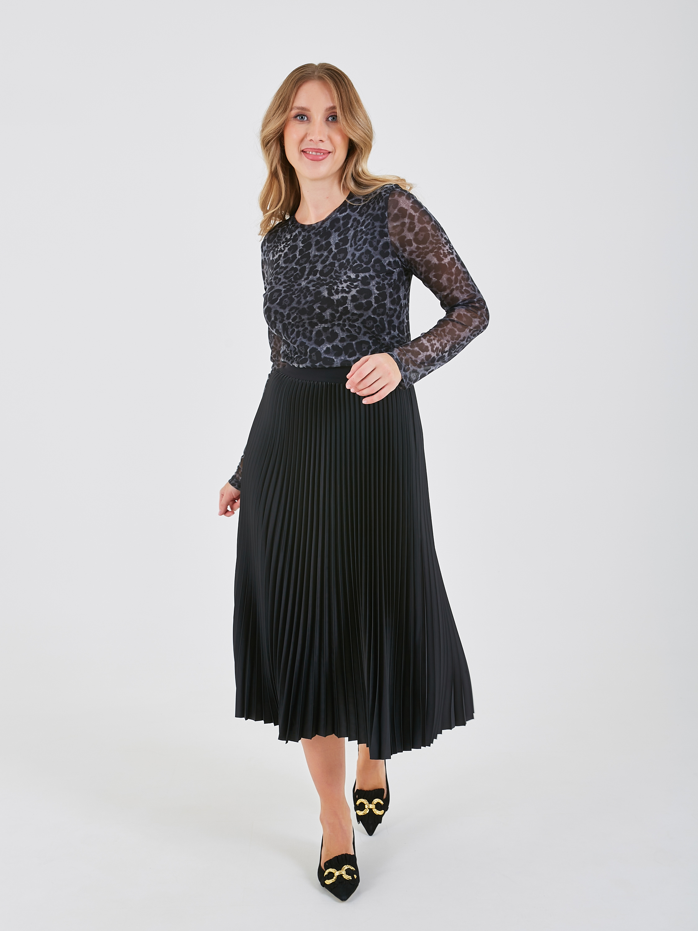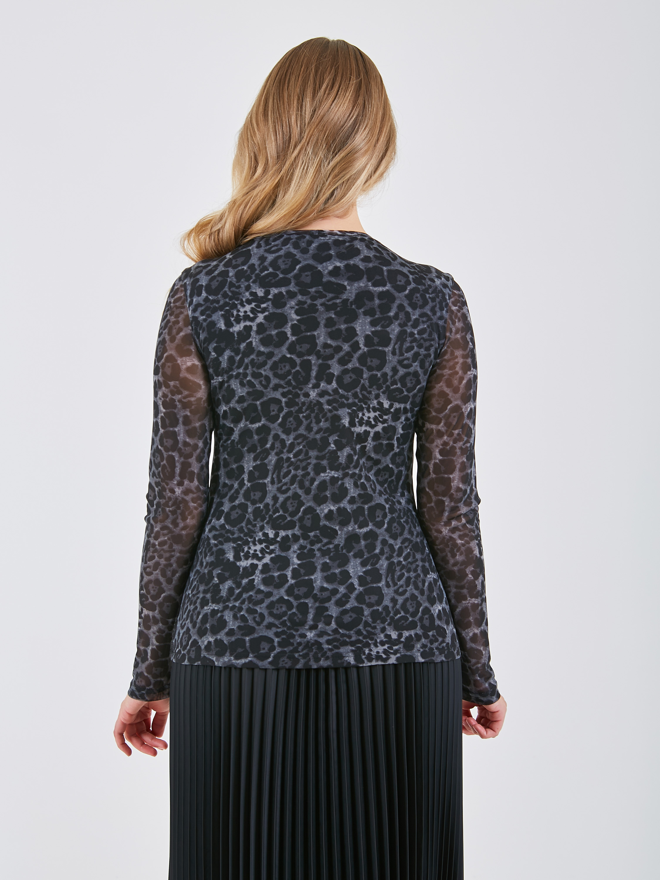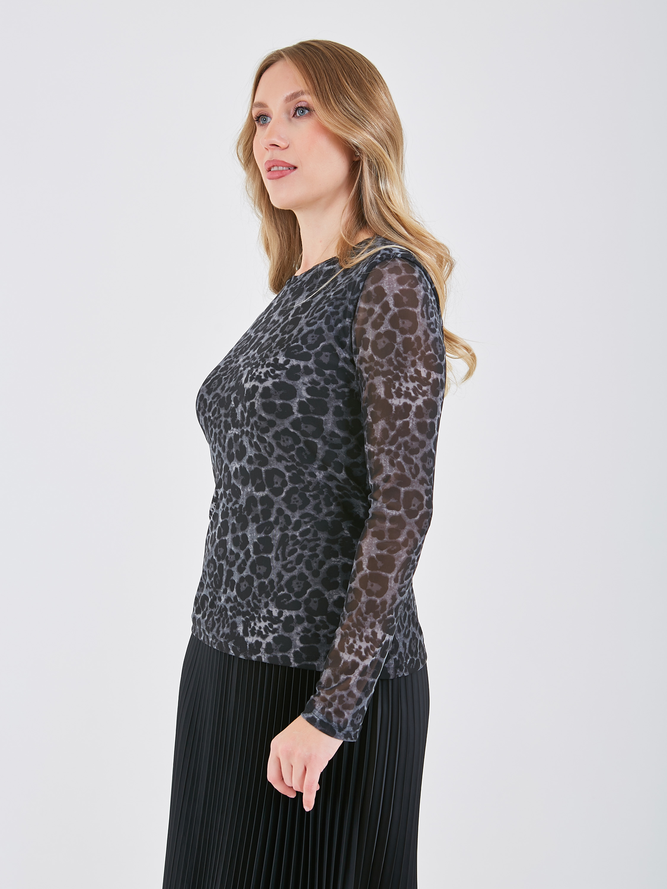 Приталенная блузка с леопардовым принтом. Полупрозрачная фактура на рукавах придаёт лёгкость и изящество. Коллекция Осень-Зима 2024-2025. Капсула "Гостья из будущего".