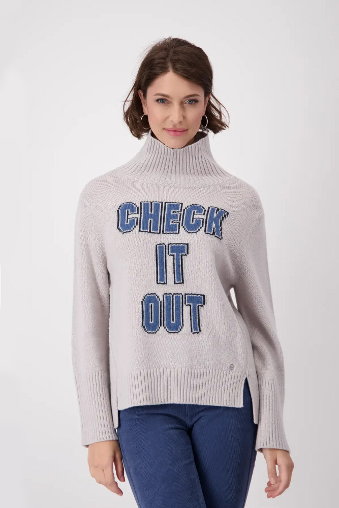 Вязаный свитер MONARI выделяется ребристым воротником-стойкой, широкими манжетами и развитым боковым швом с боковыми разрезами.