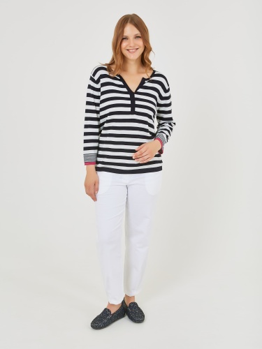 Джемпер в полоску с ярким кантом по рукаву. Весна-Лето 2025. Капсула "Самарканд". Параметры модели: 95-64-101, рост 175, размер 44-46