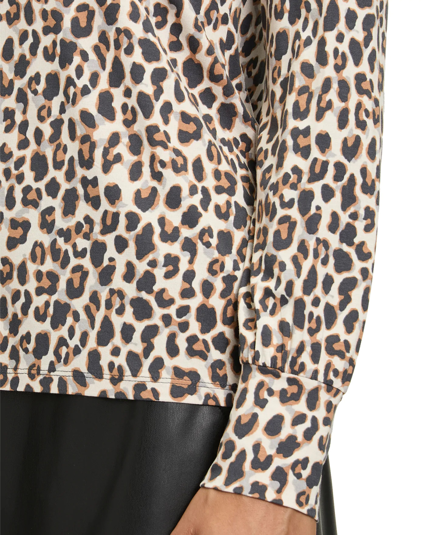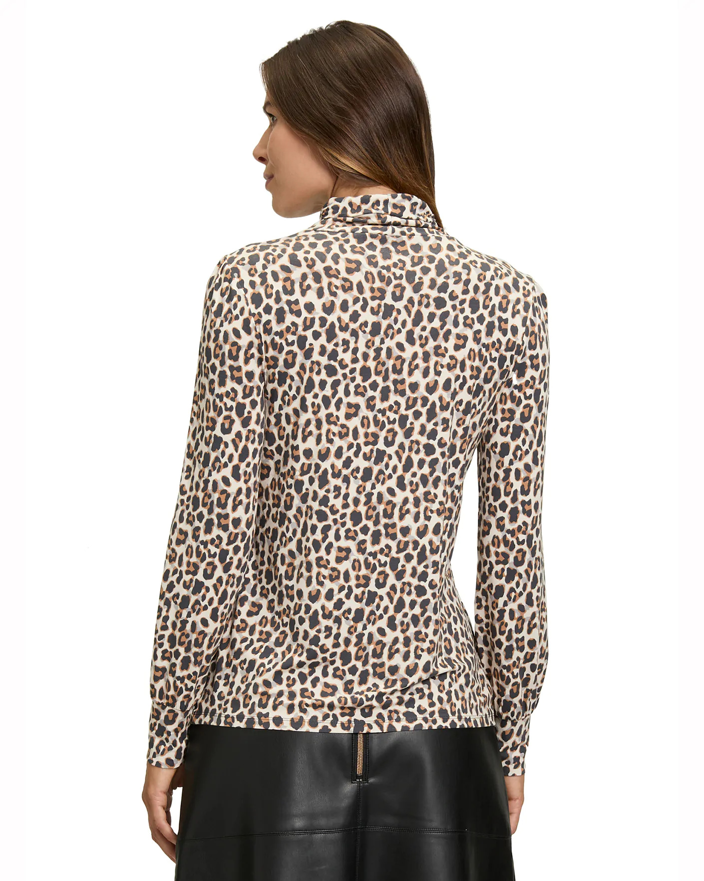 Приталенная водолазка бежевого цвета в леопардовый принт. Модель с воротником-стойкой и длинными рукавами с широкими манжетами.