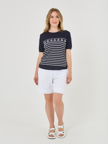 Джемпер выполнен в темно-синем цвете и украшен горизонтальными полосками и узором с якорями. Короткие рукава и комфортный крой, делает его подходящим для теплой погоды и повседневного ношения. Коллекция Весна-Лето 2025. Капсула "Самарканд". Параметры модели: 89-70-92, рост 167, размер 44-46