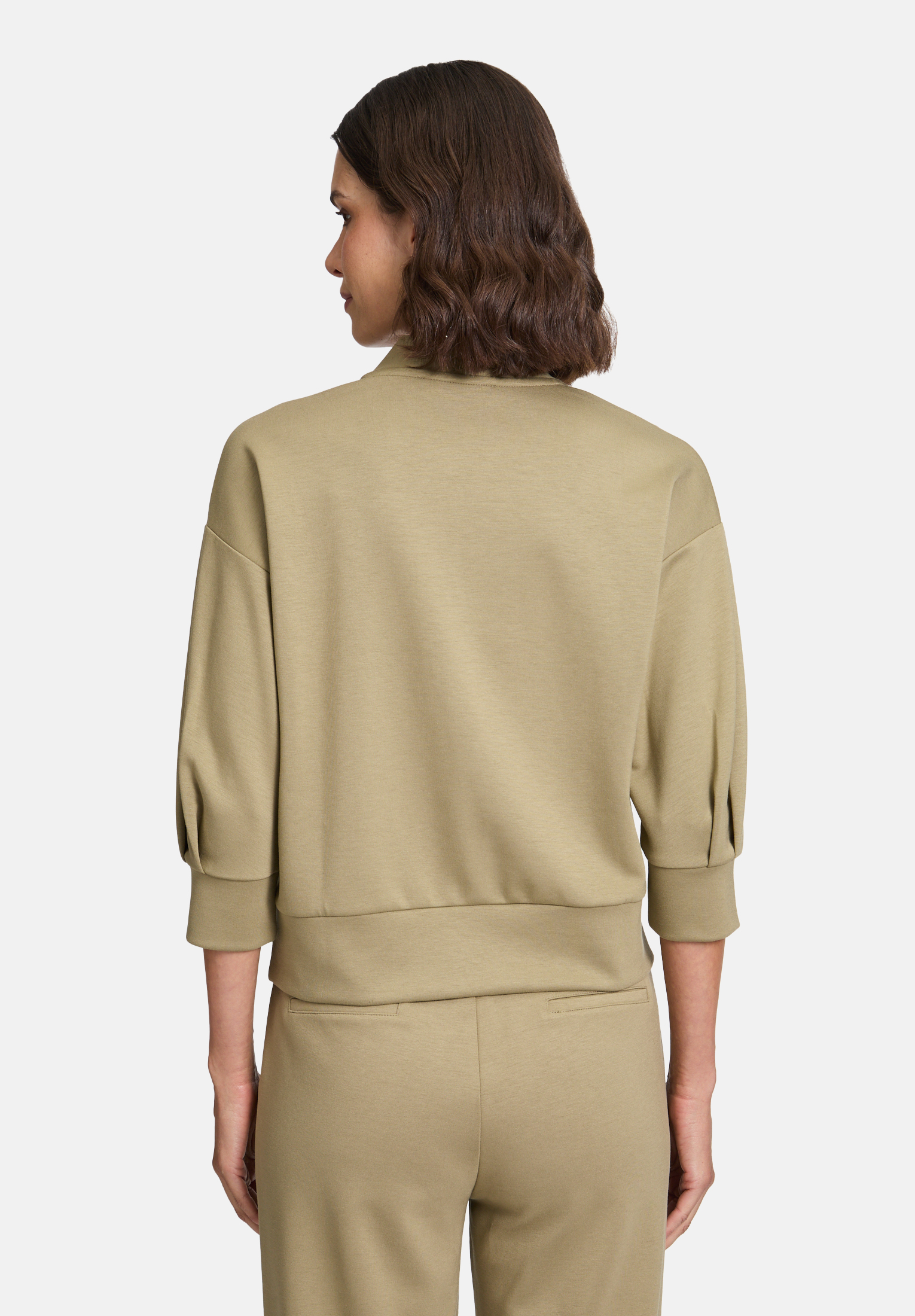 Эта повседневная толстовка с рукавами 3/4 и V-образным вырезом дополнена модным воротником-стойкой и элегантной вышивкой. Однотонный дизайн универсален, а модный крой и детали создают современный образ. Она идеально подходит для стильного повседневного ношения, сочетая комфорт и актуальный дизайн.