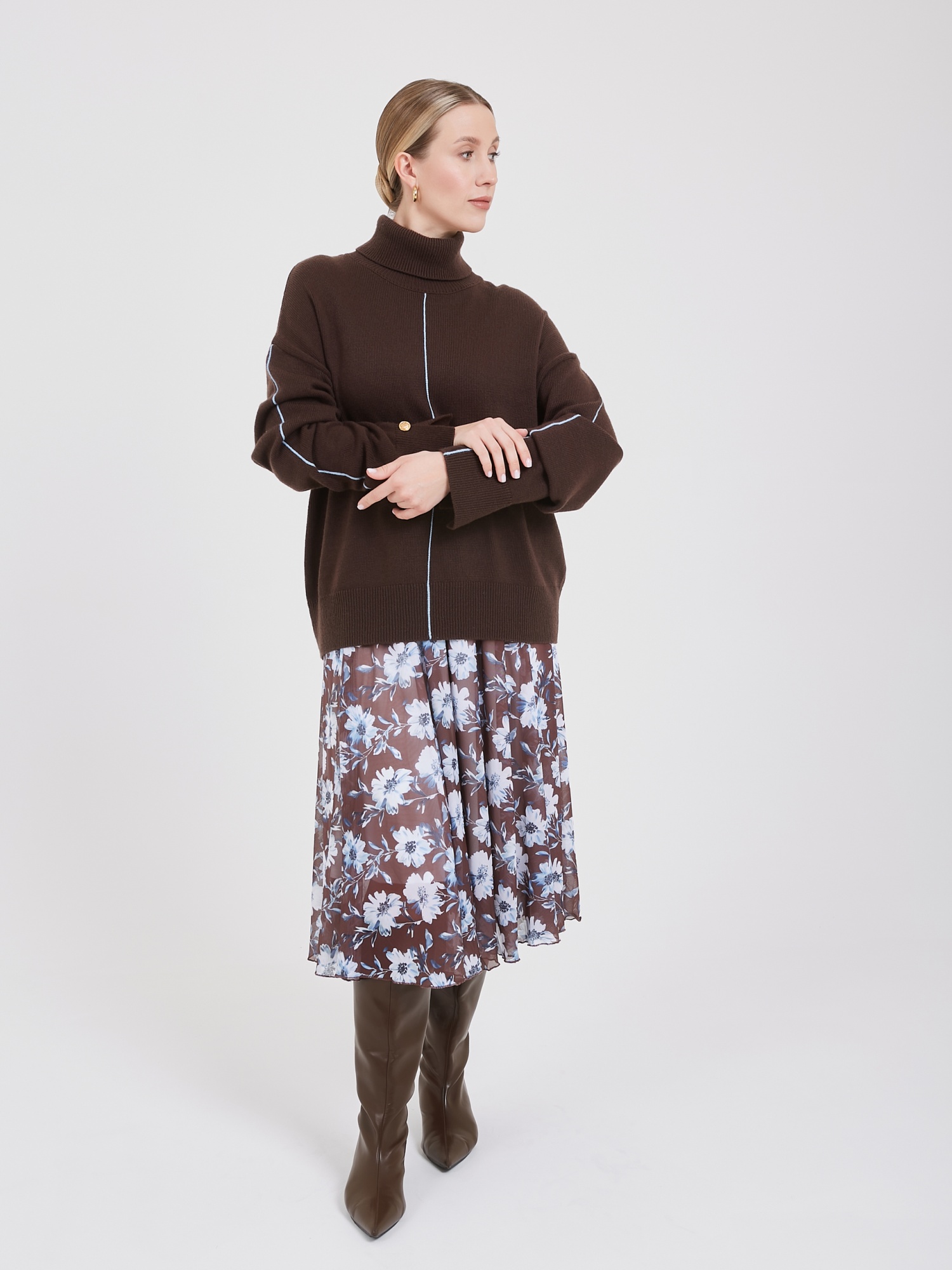 Уютный и мягкий джемпер с высоким горлом - воплощение современной умной моды. В его составе присутствует инновационная анти-пилинг нить, позволяющая сохранить высокие тактильные свойства и прочность материала. Среди деталей выделяются золотые пуговицы на манжетах, вертикальные прострочки по осям изделия контрастного голубого цвета и небольшие разрезы по манжетам и задней части горловины. Такой джемпер прекрасно подчеркивает особенности вашей фигуры, создавая неповторимый и привлекательный образ. Осень-Зима'25/26. Капсула "Вино из одуванчиков"