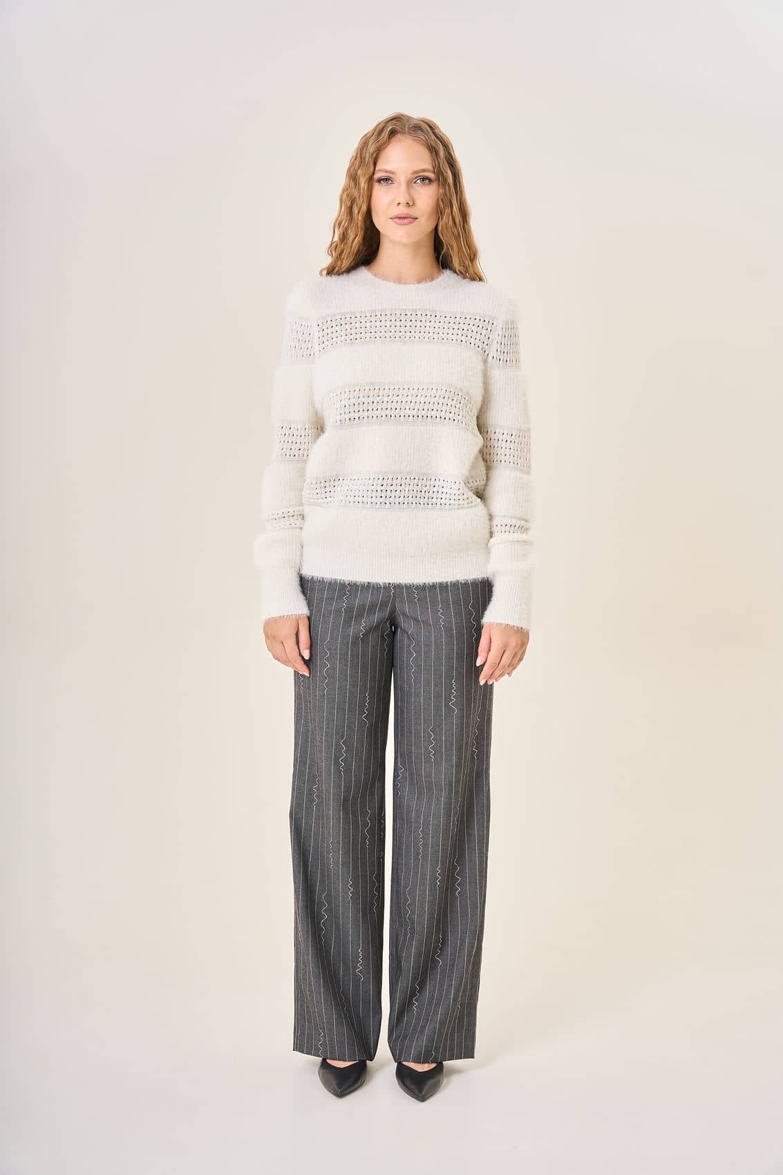 Женский молочный пушистый джемпер элегантно сочетает различные фактуры и техники вязки создавая стильный объемный рисунок. Идеально подчеркивает все преимущества фигуры корректируя недостатки благодаря мягкому облегающему крою. Рельефные полосы визуально добавляют объема и создают ощущение многослойности. Мягкий материал приятен к телу, обеспечивает тепло и уют в прохладное время года. Осень-Зима'25/26. Капсула "Вишневый сад"