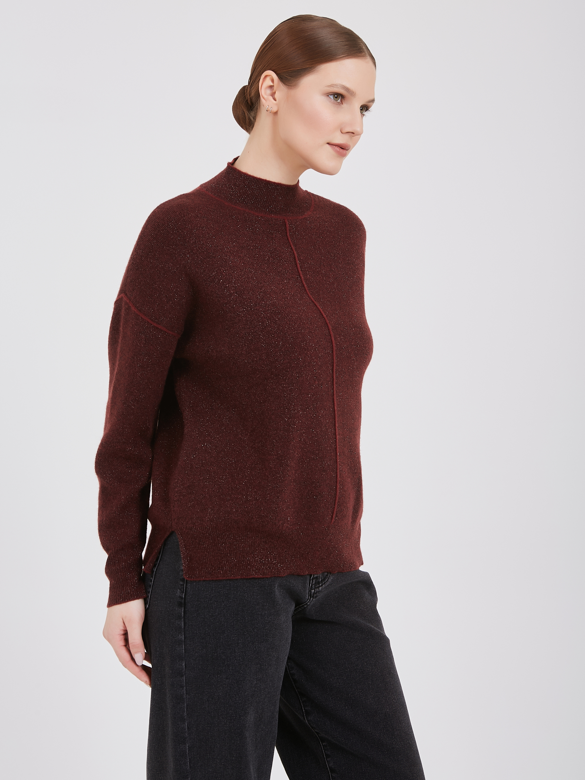 Бордовый свитер с высоким воротником и длинными рукавами. Элегантный образ подчеркивает выразительный вертикальный шов спереди. Свитер дарит ощущение комфорта и тепла в холодную погоду.Осень-Зима'25/26. Капсула "Вишневый сад"