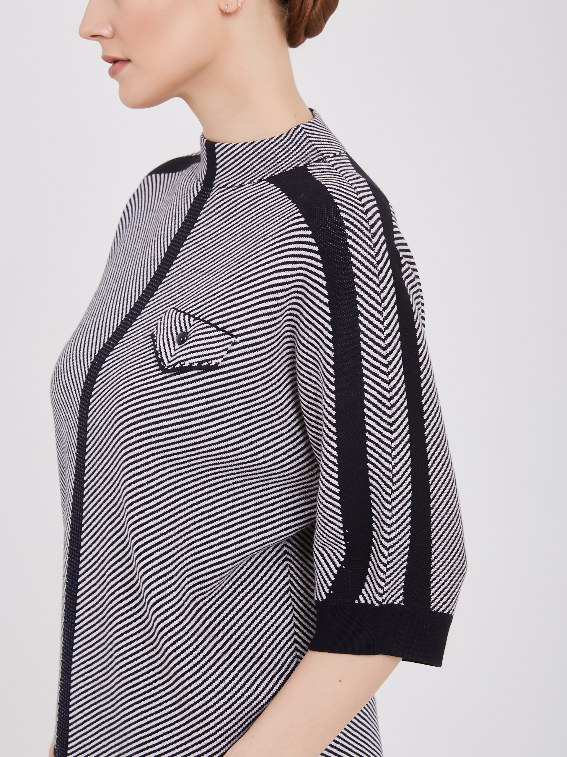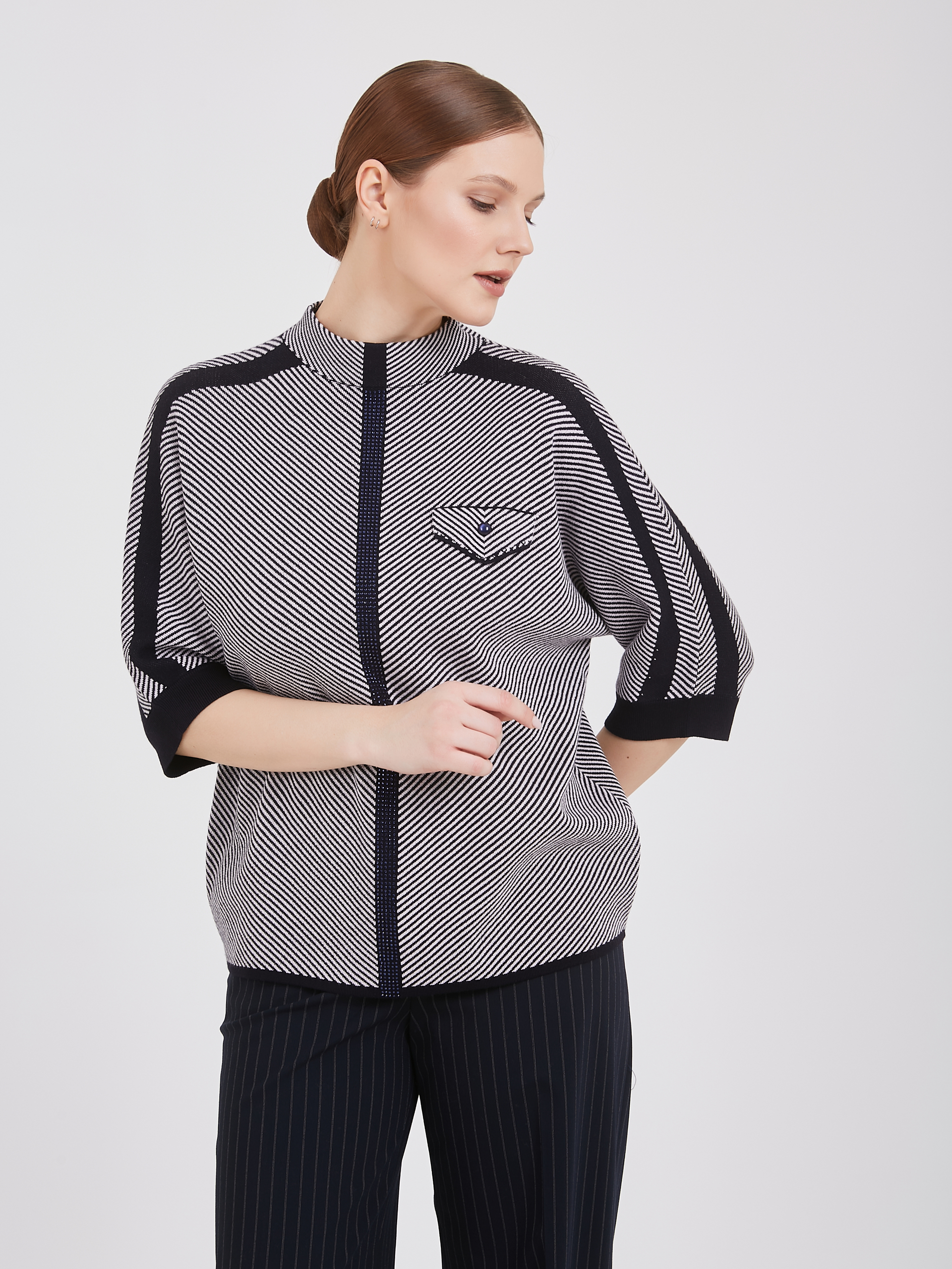 Женский джемпер с динамичным дизайном: диагональные полосы белого и тёмно-синего оттенков начинаются от правого плеча и плавно спускаются к левому краю. Центральная линия и плечи украшены контрастной тёмно-синей отделкой, усиливающей визуальное восприятие. Небольшой накладной карман слева добавляет функциональности и поддерживает общую стилистику полосатой композиции.Осень-Зима'25/26. Капсула "Лиловый шар"