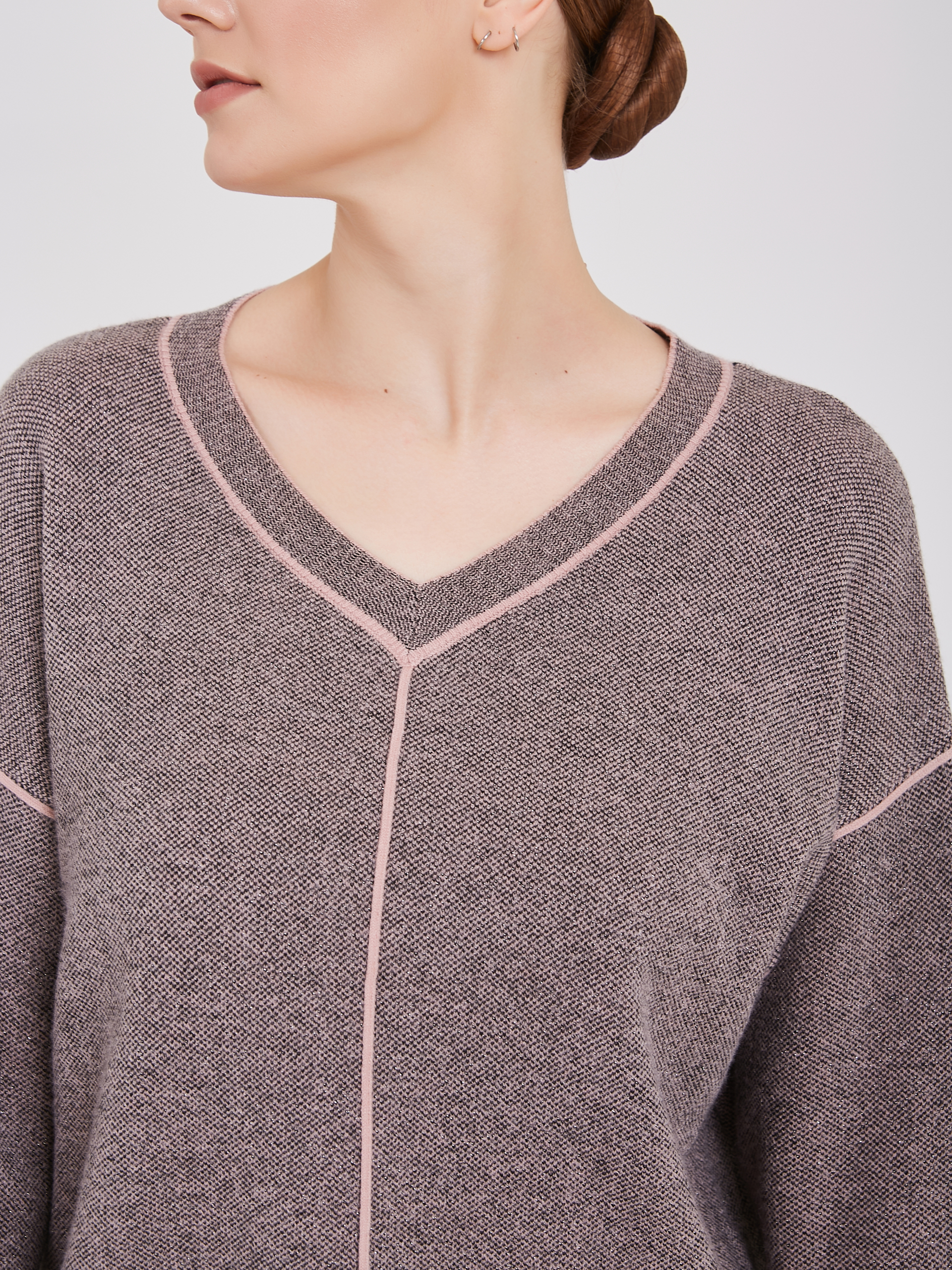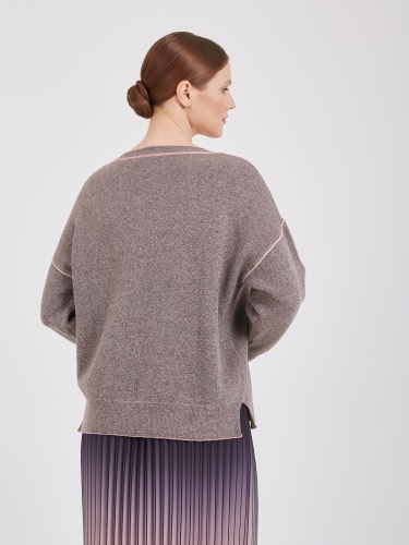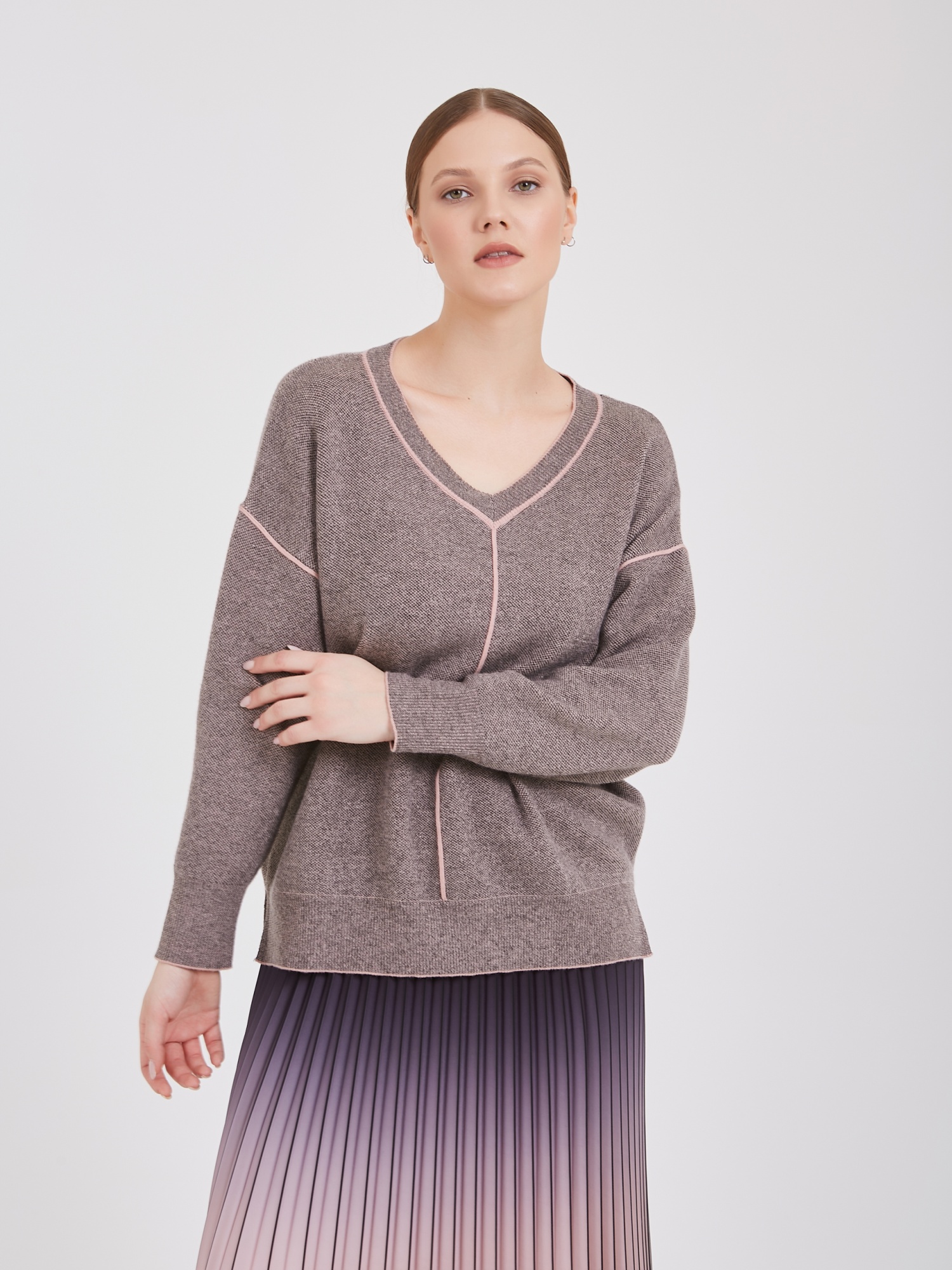 Коричневый свитер с выразительным V-образным вырезом, окантованным нежной розовой нитью. Модель отличается приятной текстурой, словно выполнена из тонкого вязания. Удлинённые рукава добавляют комфорта и завершают образ.Осень-Зима'25/26. Капсула "Лиловый шар"