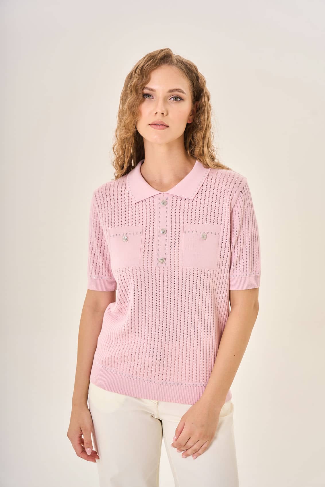 Розовая вязаная рубашка-поло с короткими рукавами. Классический воротник и три декоративные пуговицы придают ей нотку элегантности. Два небольших накладных кармана на груди украшены декоративными деталями, похожими на пуговицы или броши, добавляя шарм и оригинальность. Вертикальный ажурный узор делает рубашку воздушной и привлекательной.Отлично подойдет для создания нежного и современного образа.