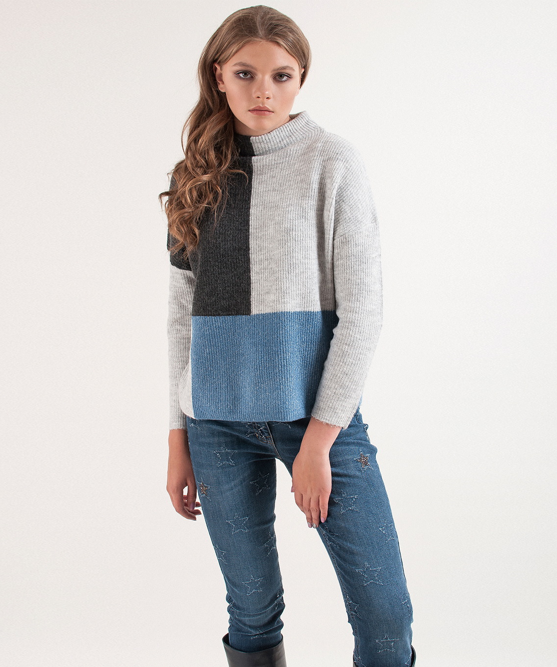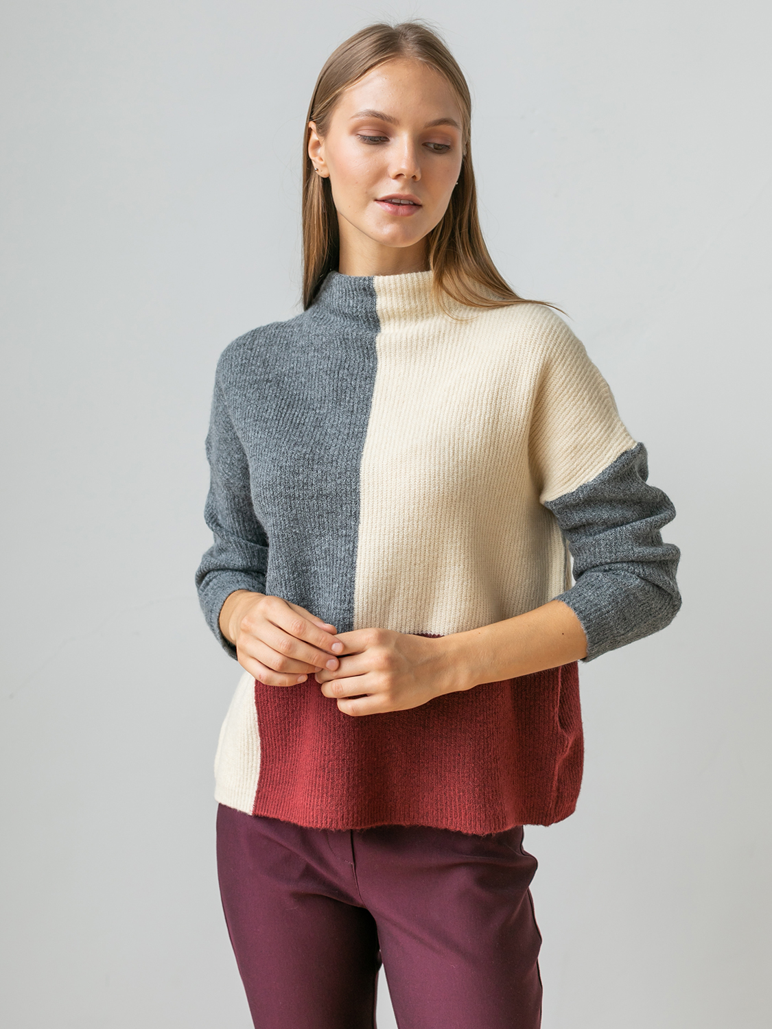 Оригинальный теплый джемпер в стиле колор-блок. Сочетание контрастных оттенков и геометрических форм создает яркий образ. Джемпер представлен в двух оттенках: красном и синем. Шерсть в составе делает материал приятным к телу. Прямой крой подходит любому типу фигуры.