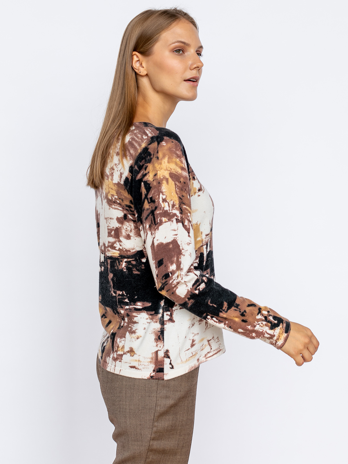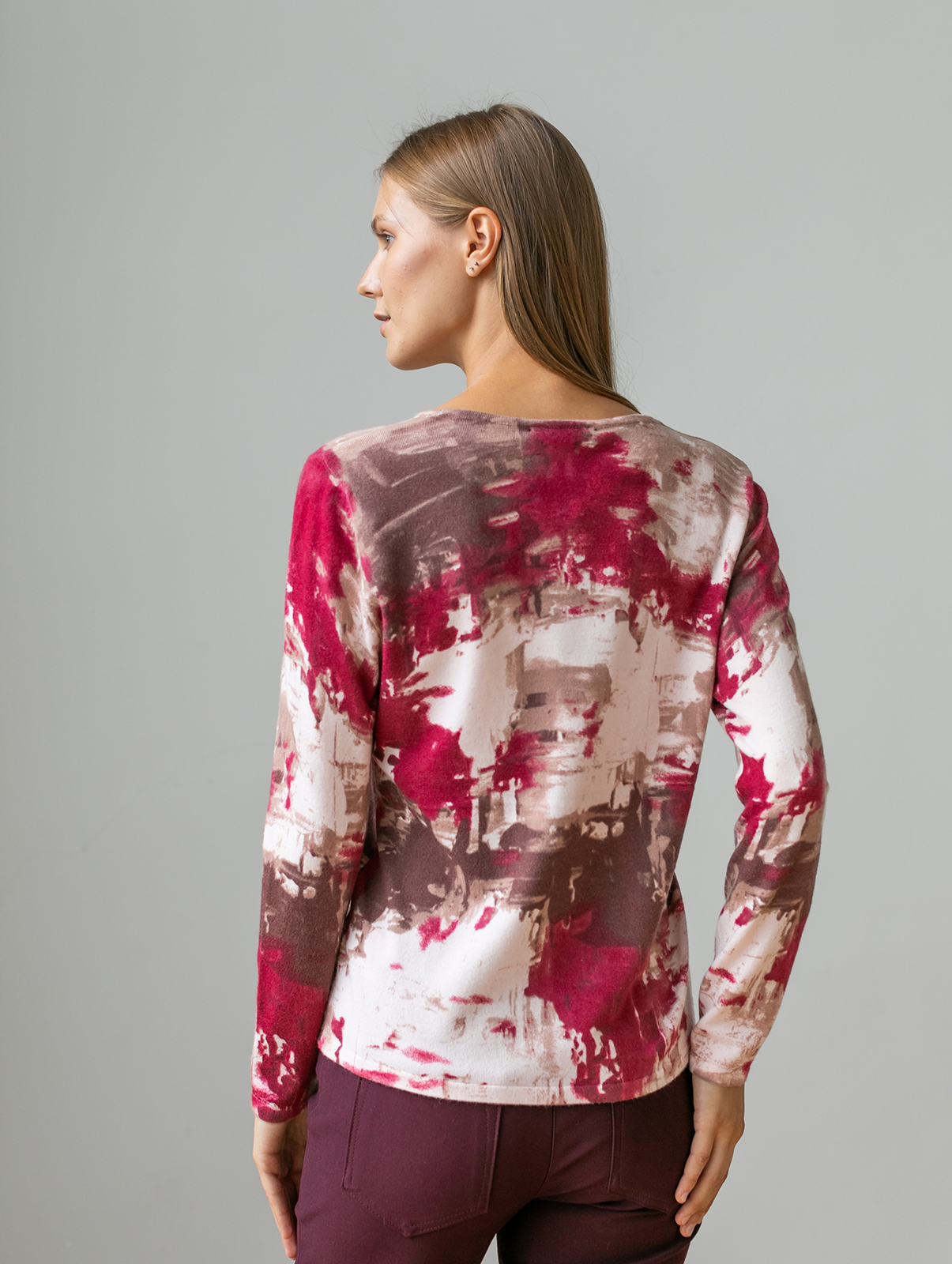 Джемпер с ярким абстрактным принтом выполнен в трех оттенках: бордовом, синем и коричневом. Широкий овальный вырез горловины подчеркивает изящество линии шеи. Полуприлегающий силуэт подчеркивает женственность форм. Джемпер сочетаетается с юбкой и брюками и расставляет яркие акценты в вашем аутфите.