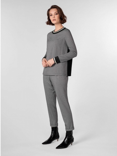 Джемпер из трикотажа прямого силуэта с круглой горловиной и втачным рукавом полной длины. Спинка контрастная черная. По горловине и манжетам контрастная отделка в полоску.
