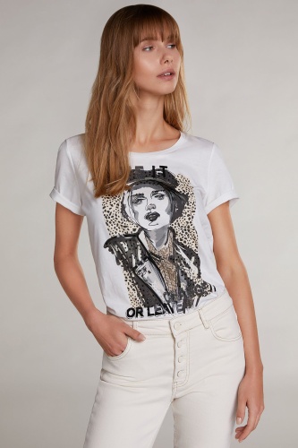 Белая футболка привлекает внимание своим смелым принтом. Прямой крой, круглый вырез горловины, короткие втачные рукава с фиксированными манжетами. Хлопковый материал приятен к телу и обеспечивает комфорт в ношении. Футболка создает демократичный образ и прекрасно сочетается как с брюками, так и с юбкой.
