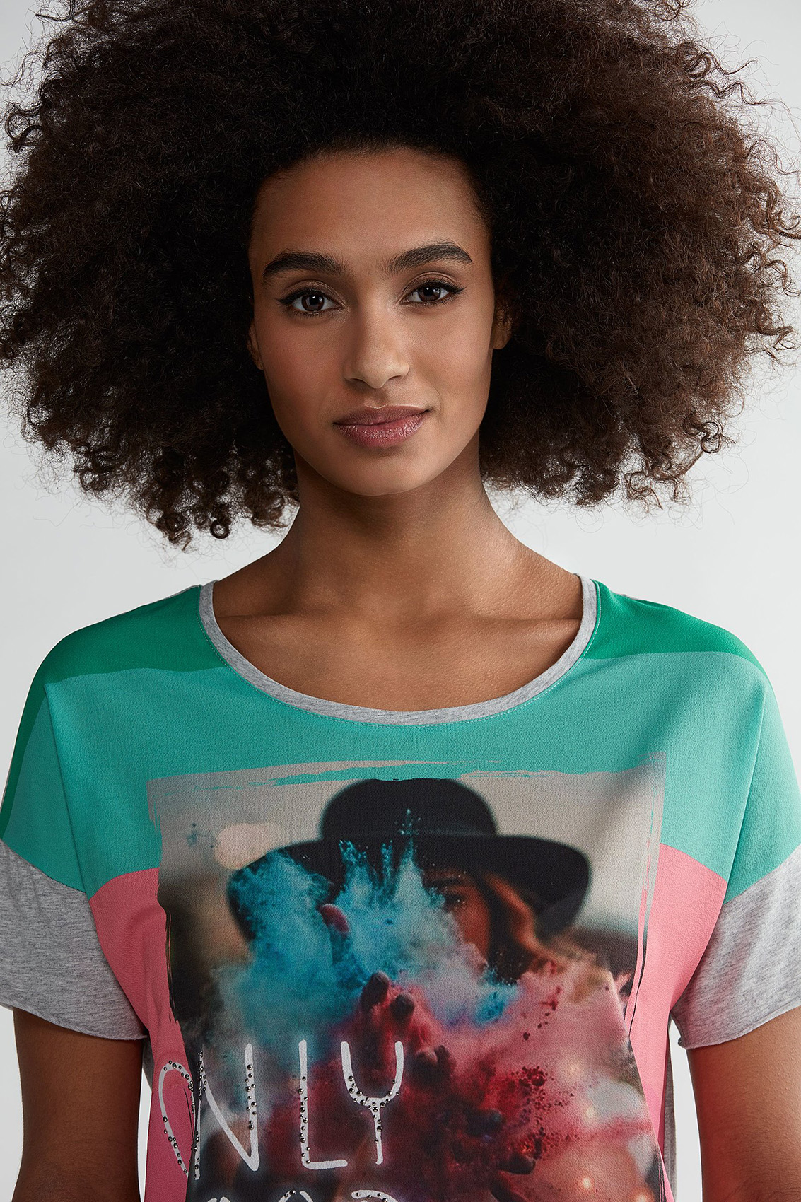 Стильная футболка с яркми принтом. Свободный покрой, круглый вырез горловины, короткий комбинированный рукав. Декор стразами придает образу нотку гламура. Приятный к телу материал из смеси модала и хлопка обеспечивает комфорт.