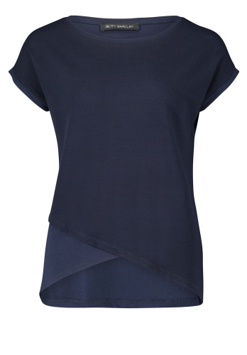 Футболка полуприталенного силуэта. Необычная фактурная ткань переда изделия. Вырез горловины "лодочка" подчеркивает элегантность и женственность обладательницы футболки. Короткие цельнокроеные рукава оформлены фиксированными манжетами. Еще один элемент дизайна - имитация многослойного низа футболки. Приятный к телу материал из вискозной смеси.