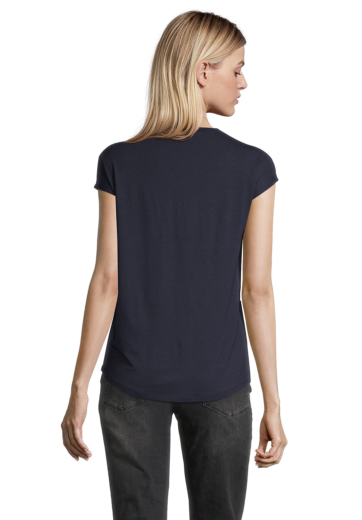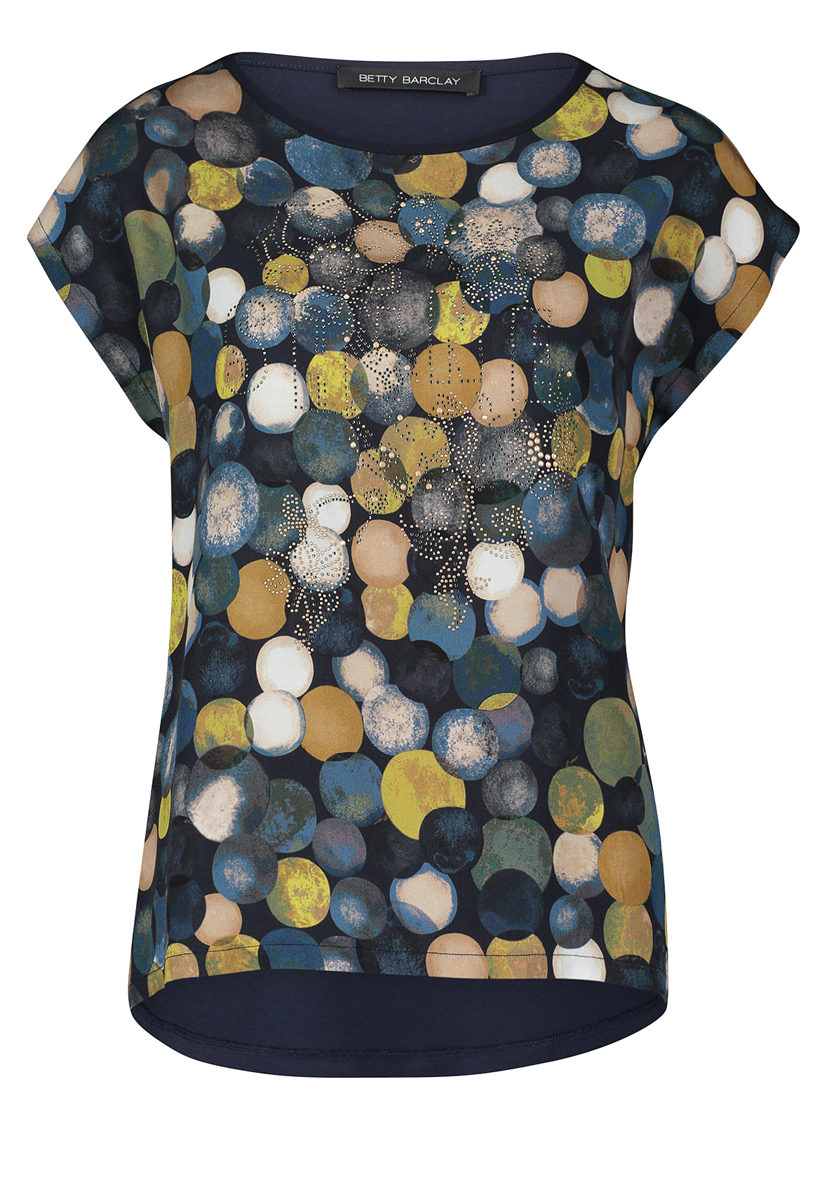 Футболка свободного покроя. Вырез горловины "лодочка", короткие цельнокроеные рукава. Приятный к телу материал из вискозной смеси. Принт в горошек по переду изделия, декор стразами придает легкий блеск. Спинка изделия выполнена из однотонного материала.