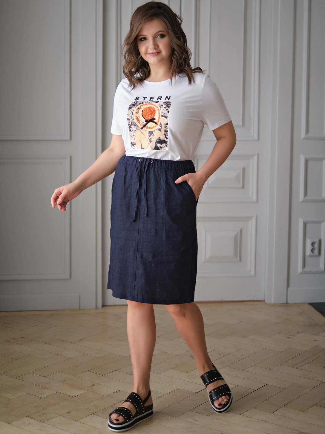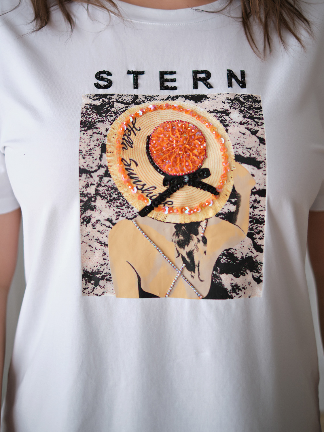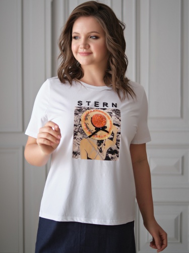 На сайте указаны российские размеры. Ткань: смесь из гладкого комфортного модала ( 47,5%), дышавшего хлопка (47,5%) и эластана (5%). Крой: белая базовая футболка слегка приталенного силуэта. Имеет круглый неглубокий вырез и короткий свободный рукав-реглан. Футболка средней длины, закрывает область живота, не поднимается вверх при движении. Отделка: Stern-girl достаточно всего самого лучшего: стильного принта с девушкой в шляпке, украшенного россыпью переливающихся бусин, жемчужного бисера и сверкающих пайеток. Вышитая камнями надпись Stern позволяет видеть обладательницу хорошего вкуса издалека! Сочетается с брюками, джинсами, юбками и шортами из ассортимента Stern.