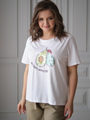 На сайте указаны российские размеры. Ткань: выполнена из гладкого хлопка высокого качества (95%) и эластана, добавляющего ткани упругости (5%) Крой: футболка прямого силуэта с коротким рукавом. Удобная, стильная, подчеркивающая достоинства фигуры. Имеет среднюю длину, закрывает область живота, надежно фиксируется благодаря наличию эластана в составе. Не поднимается вверх при движении. Отделка: футболка с милым изображением авокадо мгновенно поднимает настроение даже в самый сложный день. Принт украшен переливающимися пайетками разной фракции. Сочетается с брюками, джинсами, юбками и шортами из ассортимента Stern.
