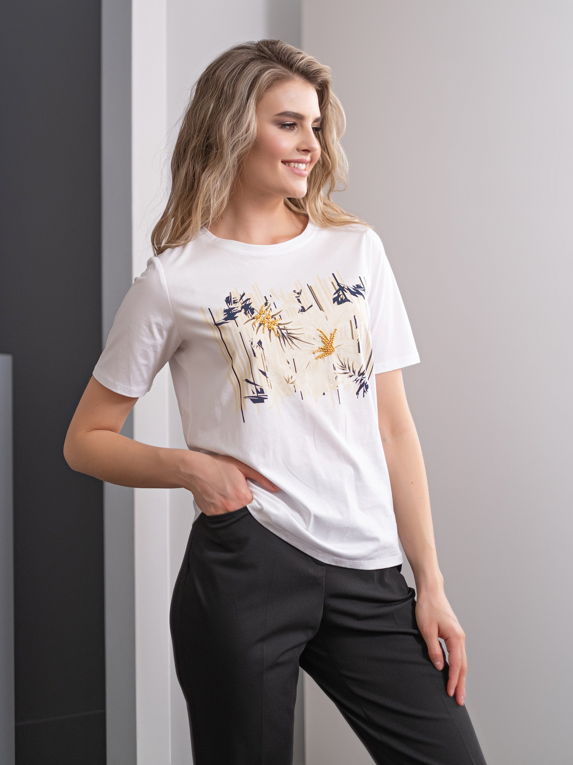 На сайте указаны российские размеры. Ткань: выполнена из 100% гладкого хлопка высокого качества. Крой: слегка приталенная модель, подчеркивающая достоинства фигуры. Имеет круглый вырез и втачной рукав-реглан. Футболка выполнена из гладкого, приятного телу хлопка, который дарит максимальный комфорт – не натирает и не раздражает кожу. Отделка: природный принт украшен золотистым калиброванным бисером, который служит дорогим акцентом всему образу. Сочетается с брюками, джинсами, юбками и шортами из ассортимента Stern.