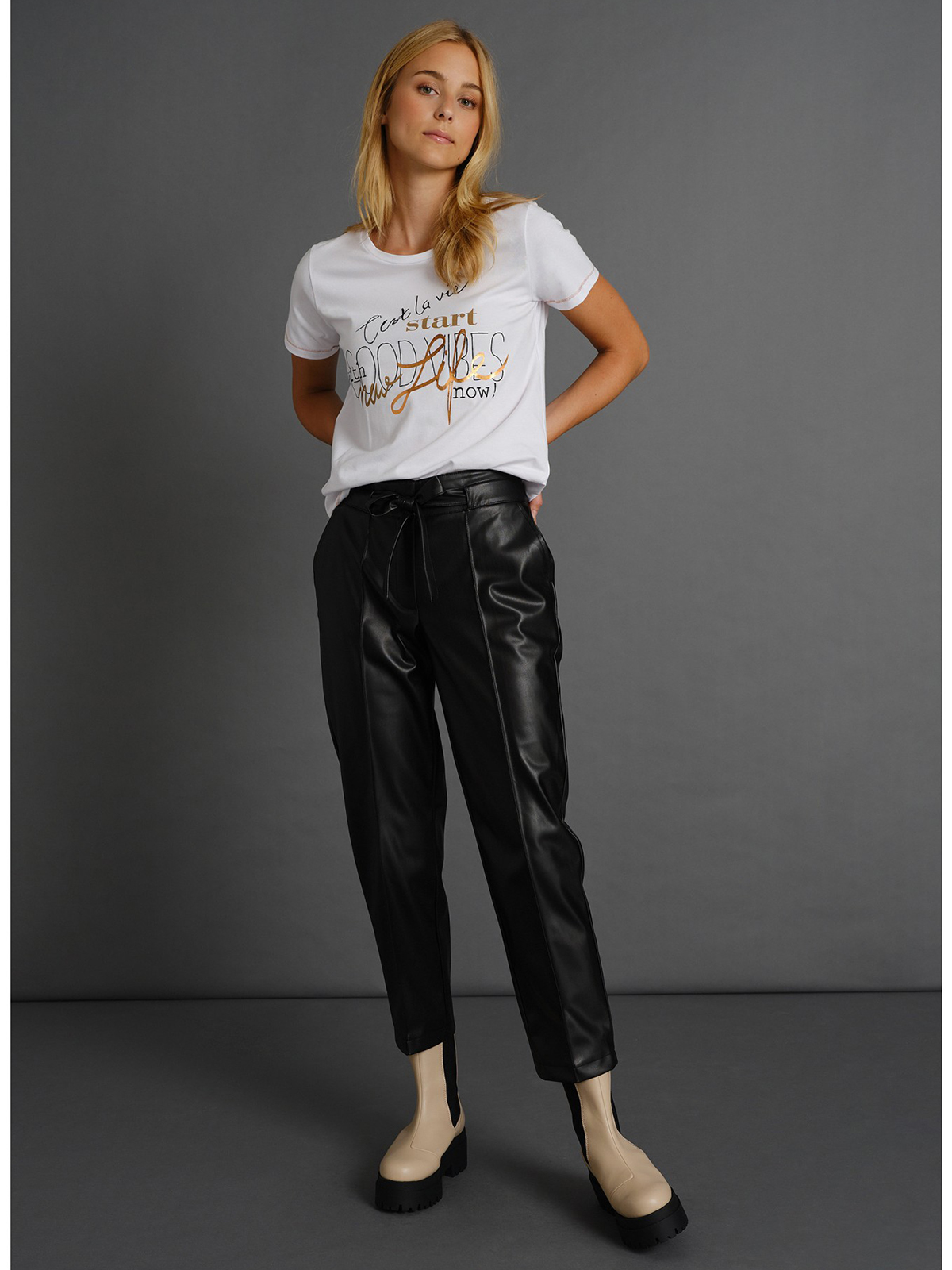 Белая футболка с принтом – базовый атрибут капсульного гардероба любой современной женщины. Cостав материала из смесового хлопка приятен к телу и обеспечивает комфортное ношение. Футболку можно носить навыпуск или заправлять в брюки или юбку.