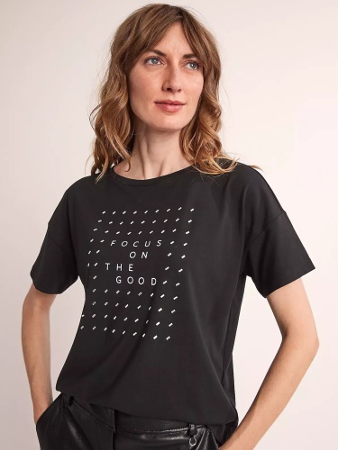 Однотонная футболка с принтом на груди. Материал из смесового хлопка обеспечивает хорошую посадку изделия по фигуре. Круглый вырез горловины, короткий втачной рукав.
