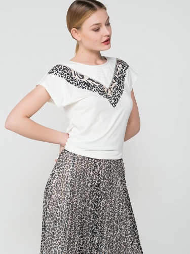Белая футболка полуприлегающего силуэта совсем не выглядит скучно! А все благодаря декору, который сочетает в себе ракушки, звериный принт и ажурные элементы.
