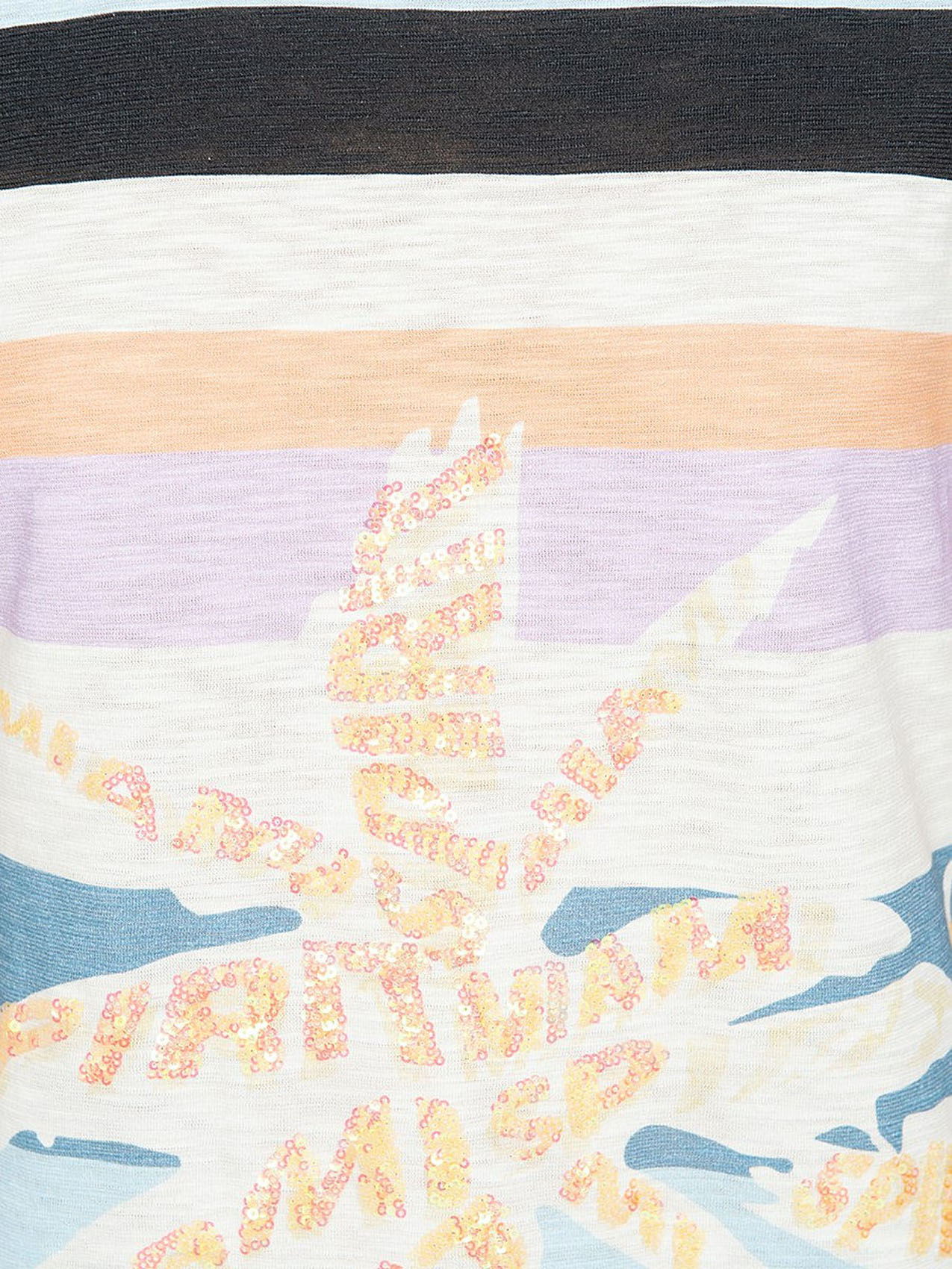 Футболка слегка приталенного силуэта. Круглый вырез, короткие цельнокроеные рукава, небольшие разрезы по бокам. Трендовая полоска. Декор: вышивка пайетками.
