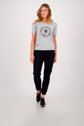 На сайте указаны Российские размеры. Серая однотонная футболка с принтом на переде изделия. Принт украшен стразами. Широкий овальный вырез горловины. Короткий втачной рукав со сборками.