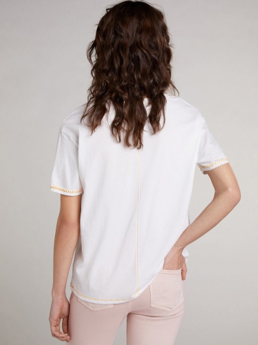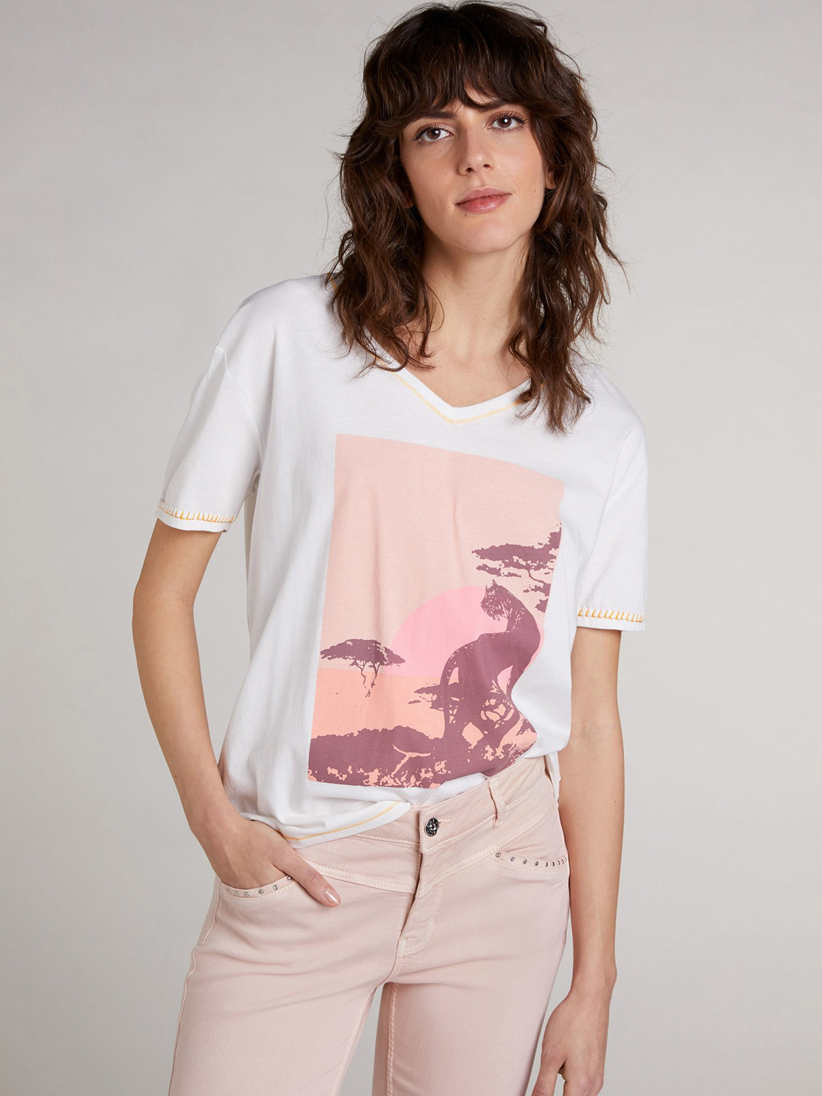 Белая футболка с анималистичным дизайном может быть самостоятельным верхом или надеваться под пиджак.V-образный вырез. Короткий втачной рукав, спущенная линия плеч.