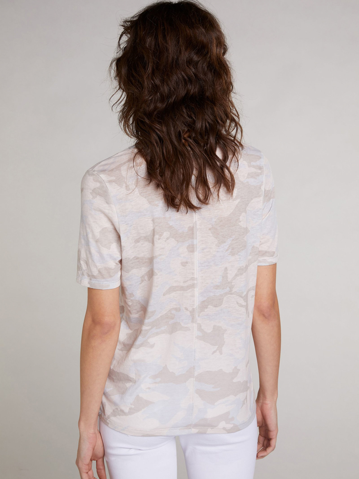Футболка в нежной расцветке может быть самостоятельным верхом или надеваться под блейзер или жакет. Короткий втачной рукав, V-образный вырез горловины.