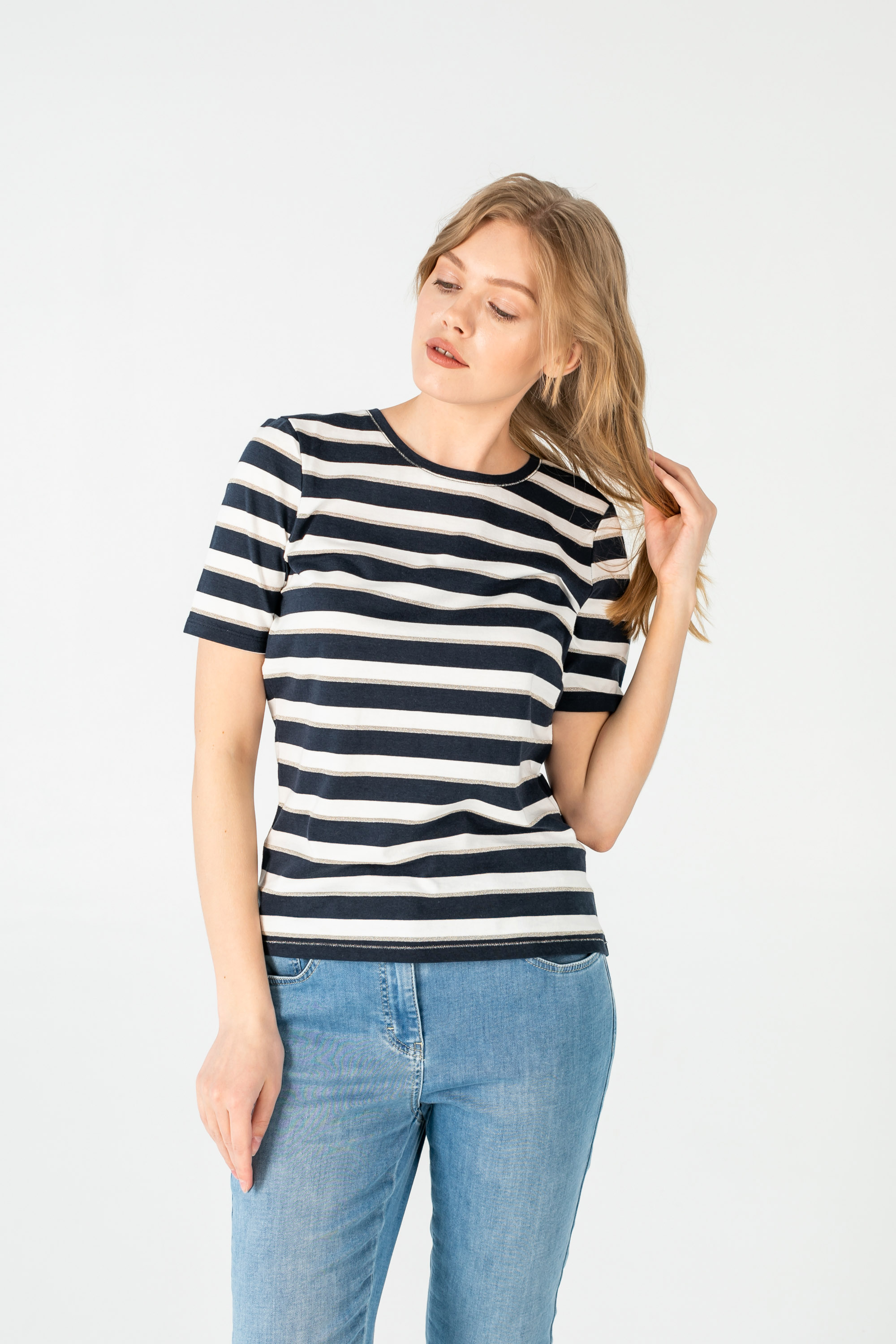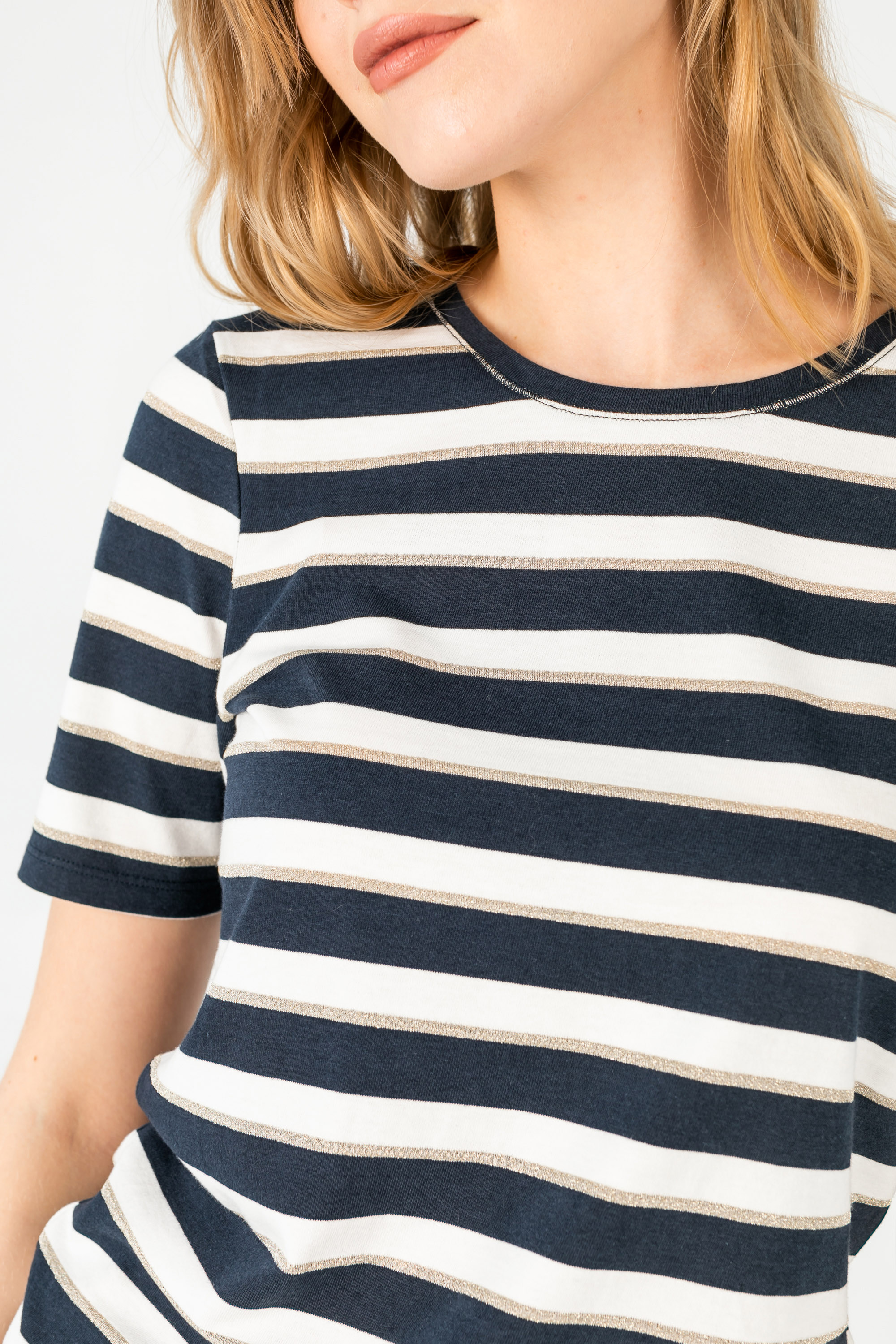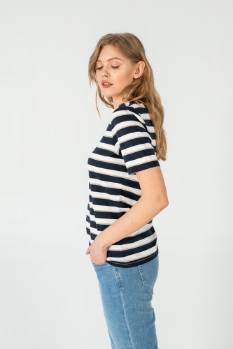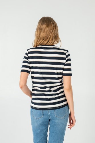 На сайте указаны российские размеры. Ткань: выполнена из гладкого хлопка высокого качества (95%) и эластана, добавляющего ткани упругости (5%) Крой: базовая футболка-тельняшка приталенного силуэта. Имеет круглый неглубокий вырез и короткий свободный зауженный рукав-реглан. Футболка средней длины, закрывает область живота, не поднимается вверх при движении. Отделка: горловина и низ футболки прострочены декоративным зигзагом. Сочетается с брюками, джинсами, юбками и шортами из ассортимента Stern.