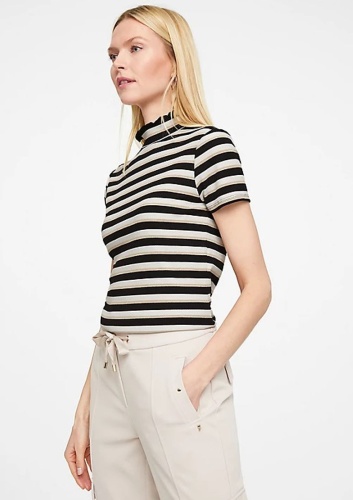 Футболка в широкую полоску – отлично выглядит как самостоятельный верх, так и в комплекте с пиджаком. Короткий втачной рукав, воротник-стойка с оборками.