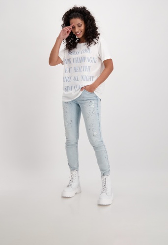 На сайте указаны Российские размеры. Футболка с короткими рукавами и круглым вырезом. На передней части футболки изображен крупный стильный текст. Прямой крой с подвернутыми концами рукавов, круглый вырез горловины с подвернутым краем и блестящим оверлочным швом с люрексом, а также удлиненная спина с закругленным низом. Параметры модели: 42 размер, рост 174 см