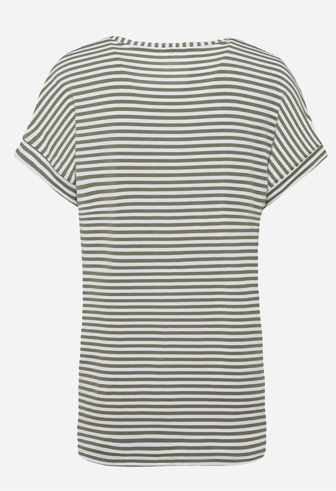 На сайте указаны российские размеры. Эта футболка - красивое сочетание сплошного цветочного принта спереди и классического полосатого узора сзади. Слегка закругленный V-образный вырез и манжеты, красиво подчеркнутые полосками. Рубашка немного длиннее сзади, чем спереди, создает красивую струящуюся драпировку и имеет облегающий крой. Бонус: он изготовлен из экологически чистого вискозного волокна ECOVERO™, созданного из древесины местного, контролируемого и органического выращивания.