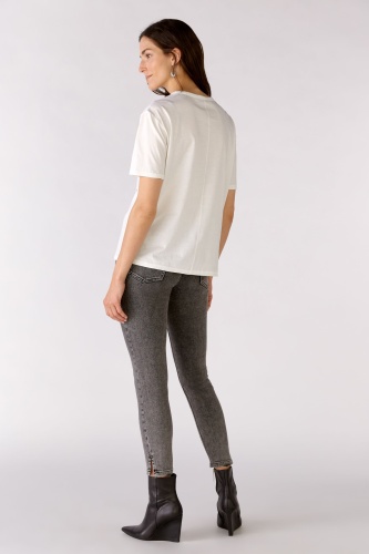 На сайте указаны российские размеры. Повседневный крой с чуть более длинными короткими рукавами. Оригинальный принт наизнанку с декоративными камнями. Контрастная цветная вышивка в форме сердца. Круглый вырез спортивного кроя. Рост модели 178 см