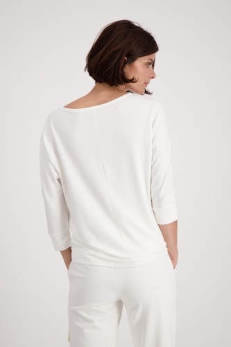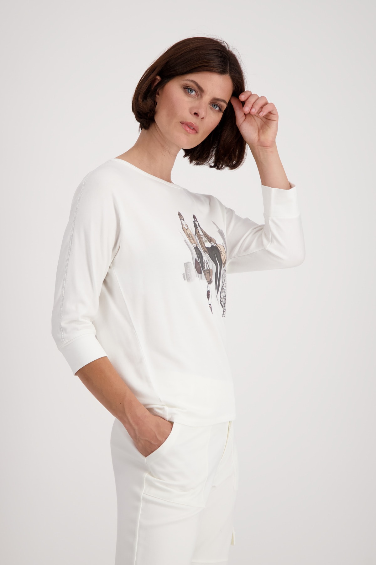 На сайте указаны российские размеры. Футболка из джерси с принтом и рукавами ¾ кремового цвета. Передняя часть этой рубашки из джерси монари украшена модным принтом с изображением двух женщин на фоне города и тигра. Работа украшена сверкающими деталями из страз. Фасон: прямого кроя со вставкой на круглом вырезе горловины, широкими манжетами на концах рукавов ¾ и объемными плечами. Изделие выглядит гламурно благодаря оверлочным швам с люрексом вдоль рукавов. Идеально подходит для хорошего самочувствия благодаря обработке струящейся вискозы, смешанной с модалом и стрейч. Модель ростом 176 см. Длина спины 44 размера составляет 62 см.