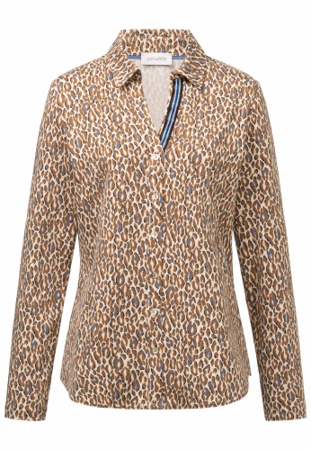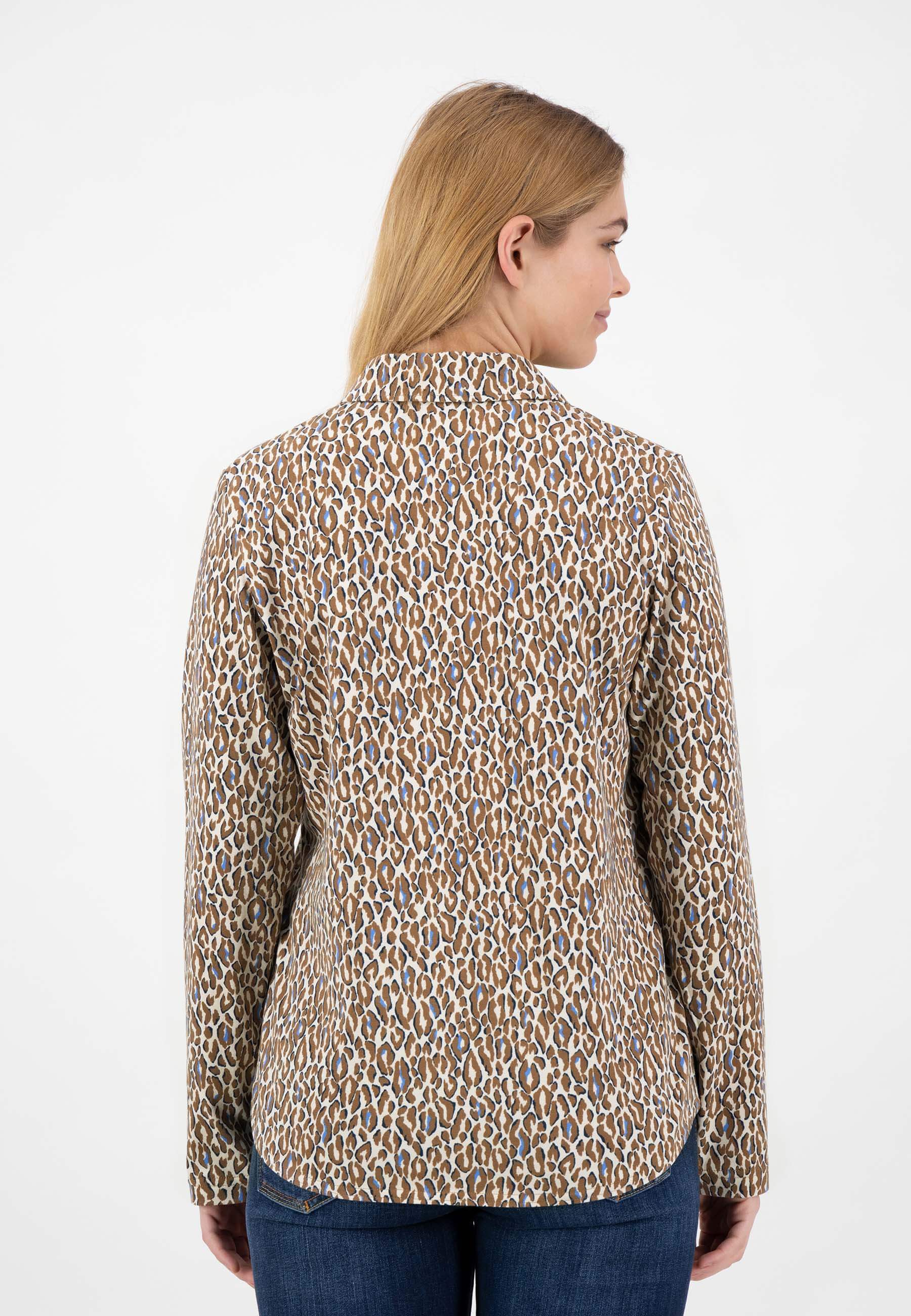 На сайте указаны российские размеры. Эластичная футболка с длинными рукавами в женственном спортивном стиле. Высококачественная эластичная смесь материалов обеспечивает приятный и высокий комфорт при ношении. Классические элементы блуз с рубашечным воротником, такие как воротник рубашки и планка с имитацией пуговиц, придают рубашке модный характер. V-образный вырез, прикрепленный к воротнику рубашки, и анималистический принт по всей поверхности делают дизайн более свободным и придают рубашке спортивный вид. Еще одним привлекательным элементом является вышитая декоративная полоса на подкладке V-образного выреза. Наша модель ростом 177 см. Измерения для размера 44: Окружность груди: 100 см Талия: 95 см Бедра: 106 см Длина спинки: 65 см. Длина рукава: 62 см.