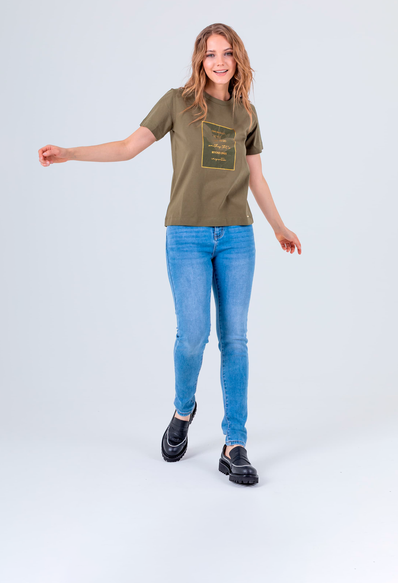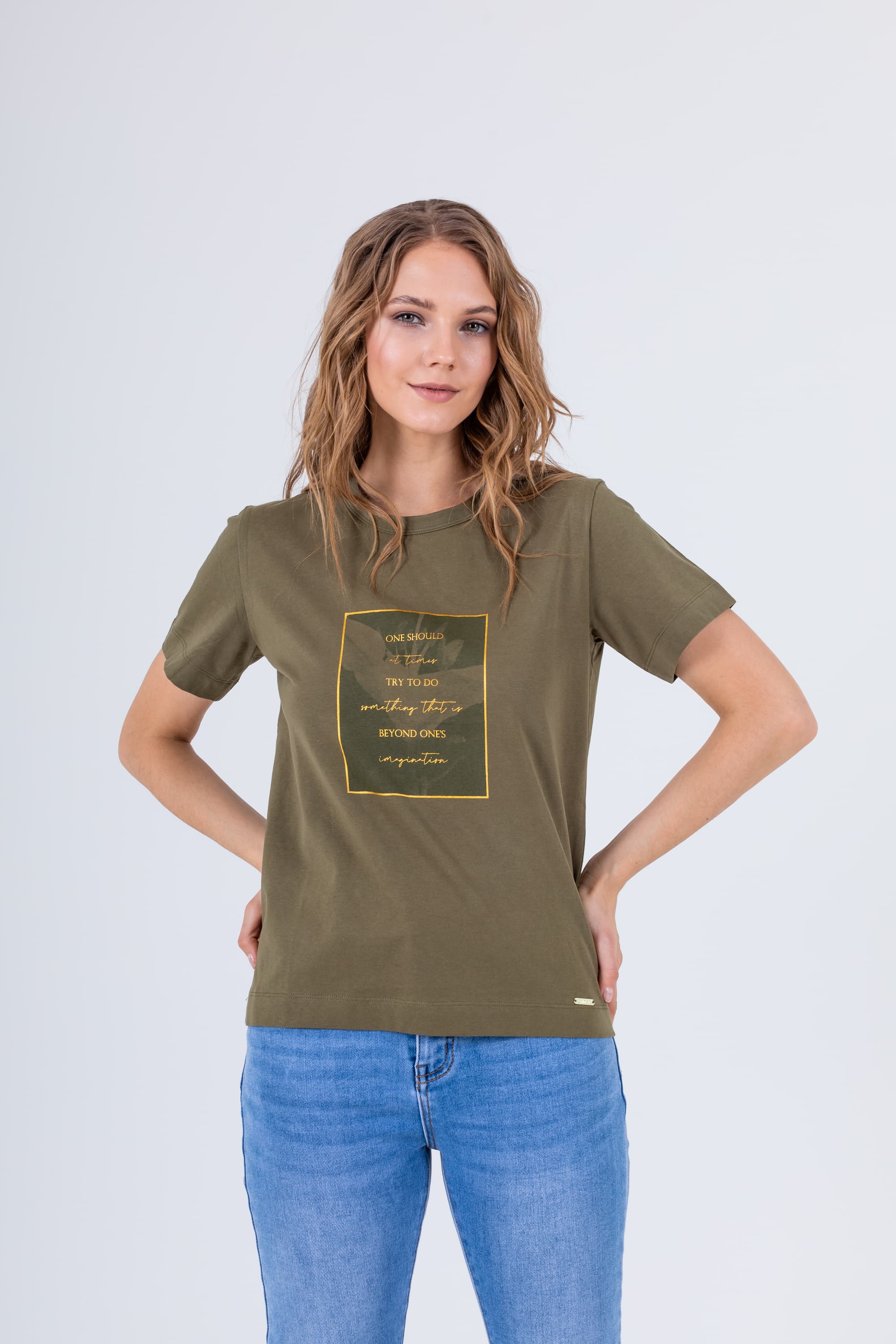 На сайте указаны российские размеры. Футболка средней длины прямого силуэта из легкого 100% хлопка. По переду выполнен растительный принт с надписями. Укороченные втачные рукава. Круглый вырез горловины.