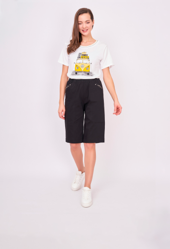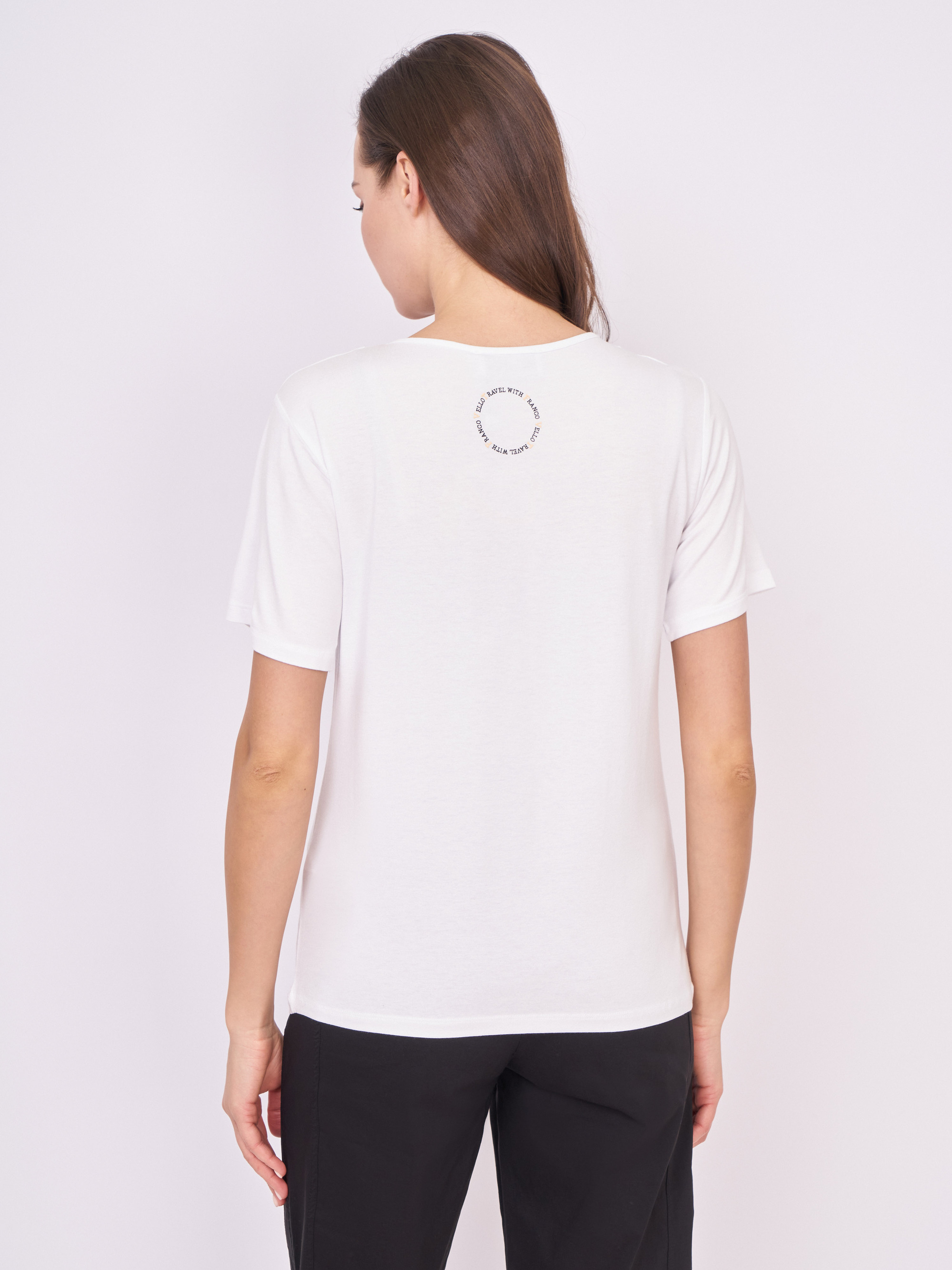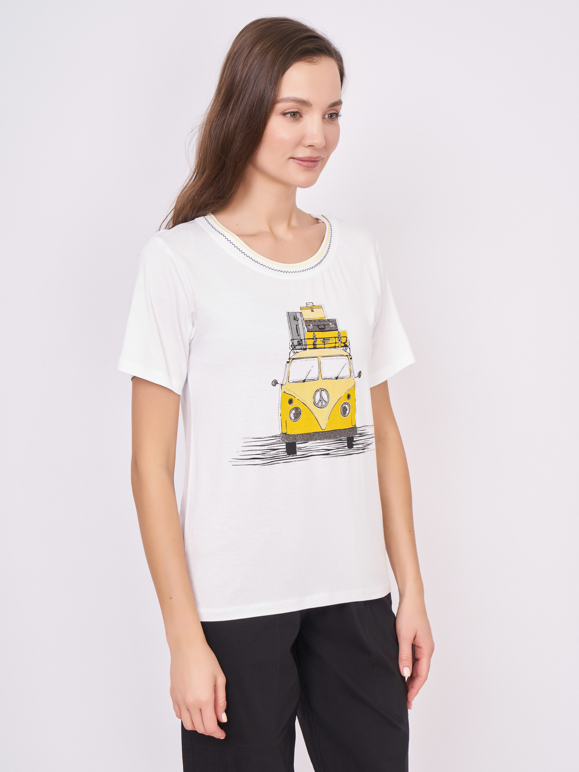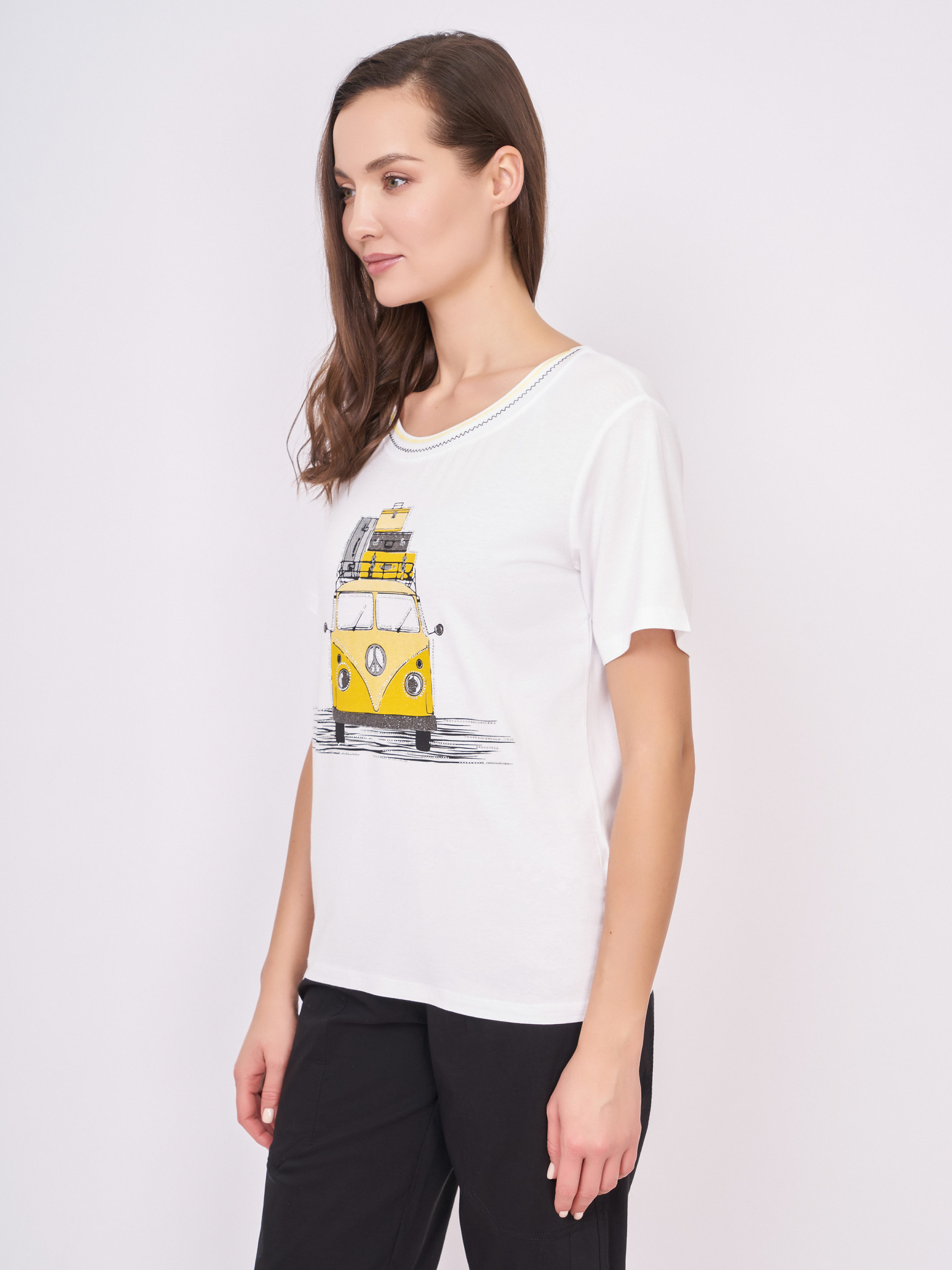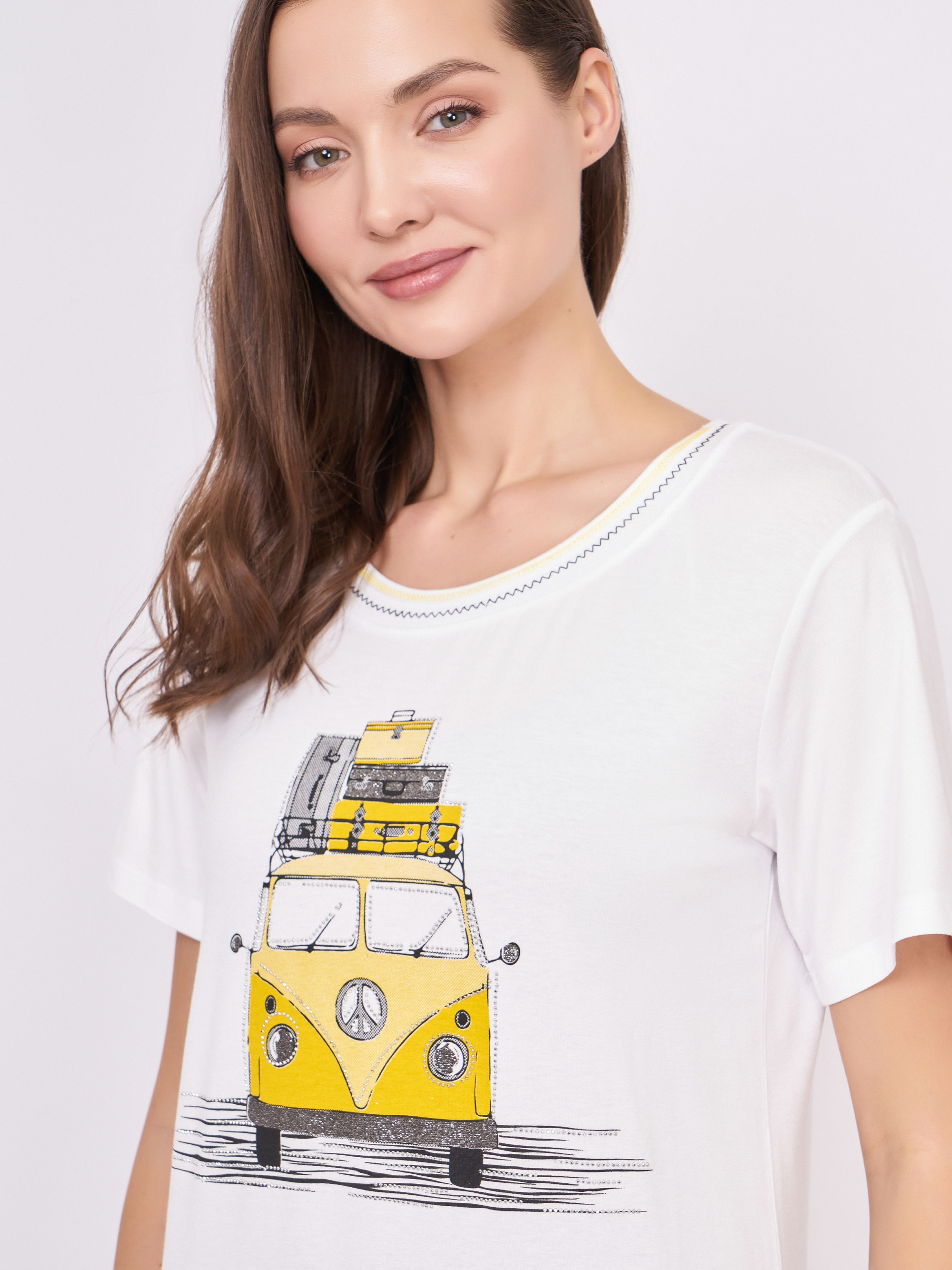 На сайте указаны российские размеры. Белая трикотажная прямая футболка с круглым вырезом, с коротким рукавом, с ярким желтым рисунком автомобиля, дополненный блестками и стразами. Длина по спинке: 58 см. Рост модели: 177 см.