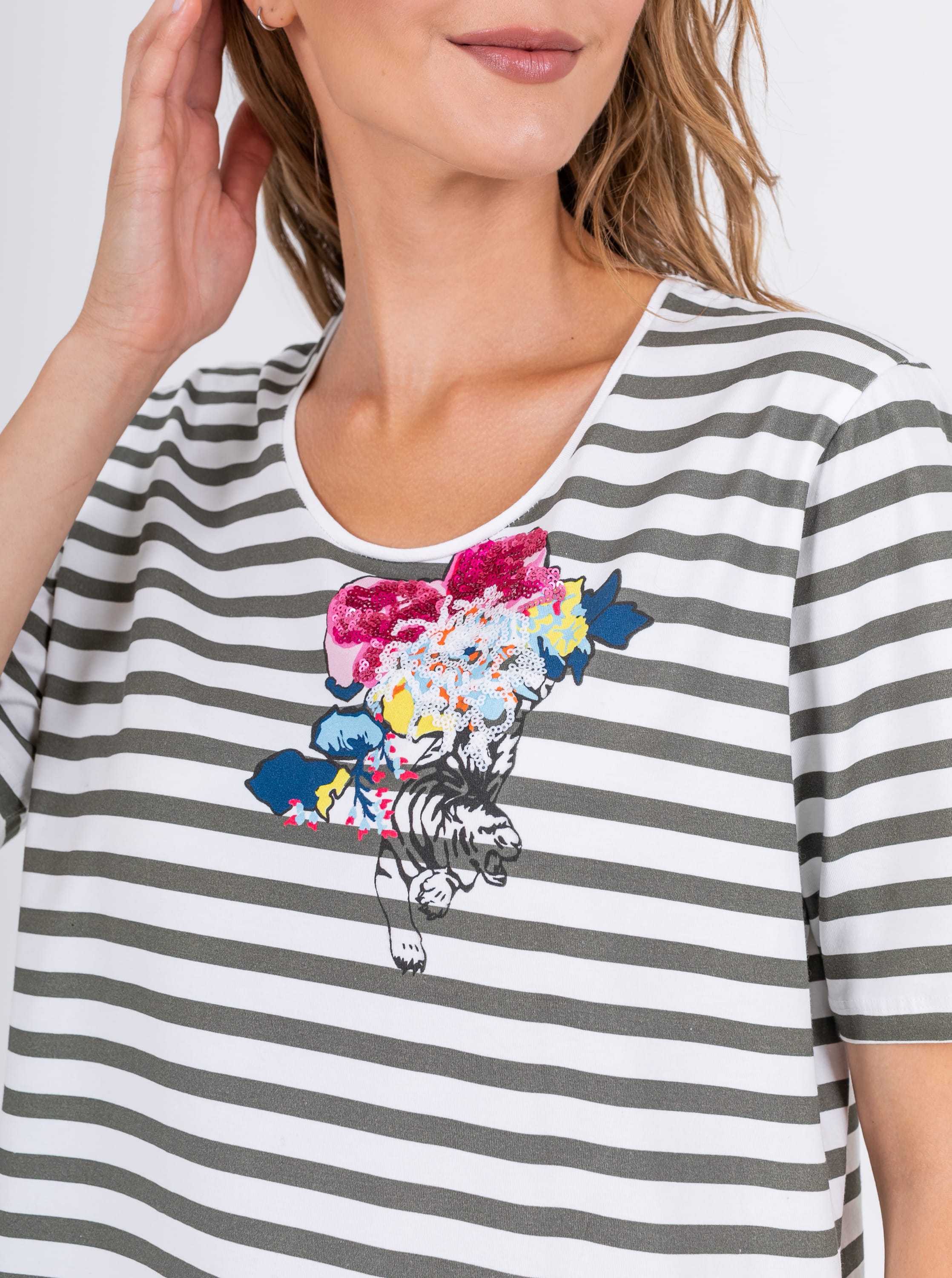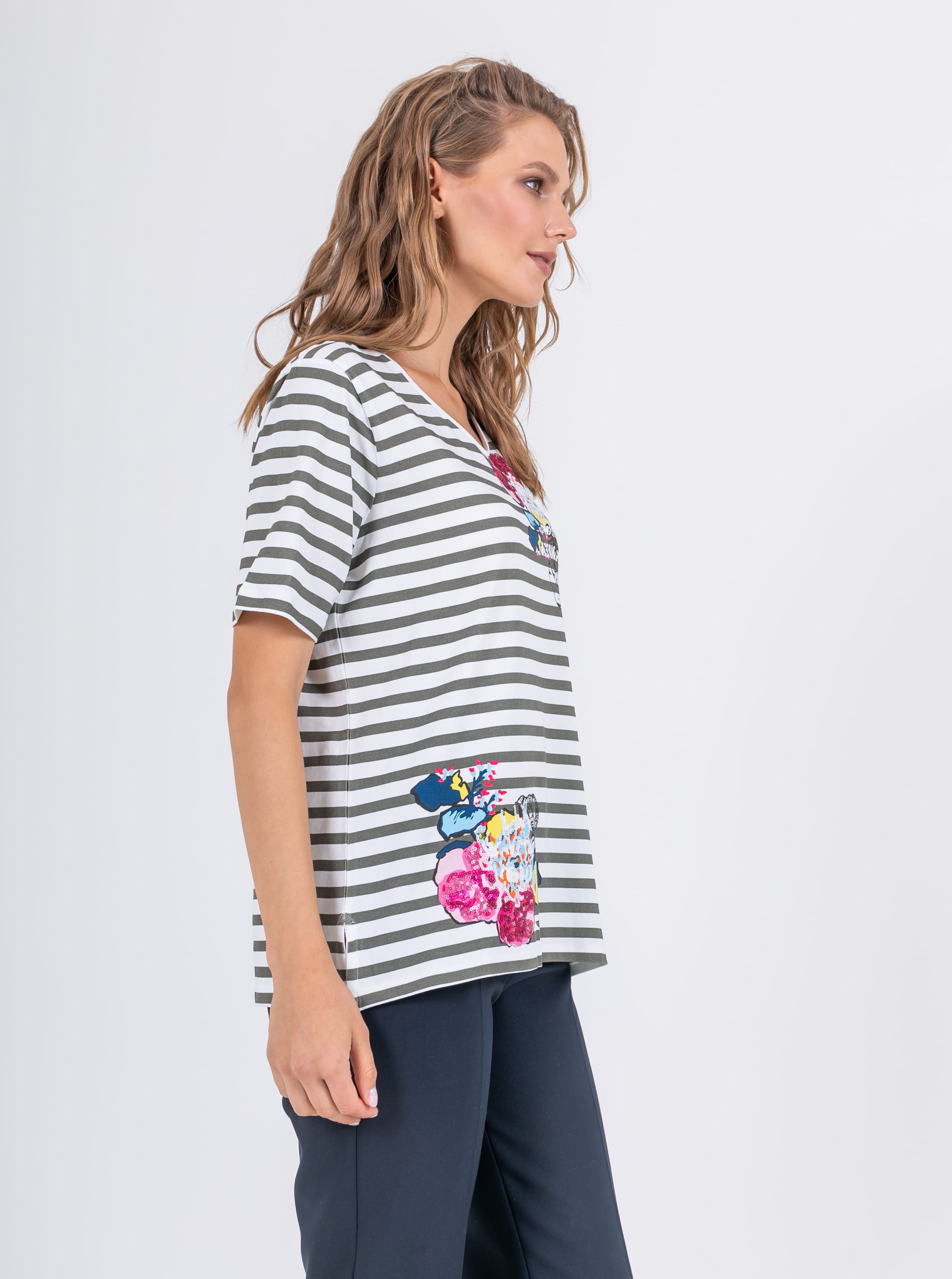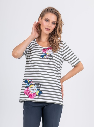На сайте указаны российские размеры. Ткань: выполнена из гладкого хлопка высокого качества (95%) и эластана, добавляющего ткани упругости (5%) Крой: футболка в полоску свободного силуэта. Имеет круглый вырез и втачной рукав-реглан. Футболка выполнена из гладкого, приятного телу хлопка, который дарит максимальный комфорт – не натирает и не раздражает кожу. Средняя длина, закрывает зону живота, не поднимается вверх при движении. Отделка: нанесенные по диагонали принты, украшенные переливающимися пайетками. Подобрать брюки, шорты или джинсы можно в соответствующих разделах на сайте.