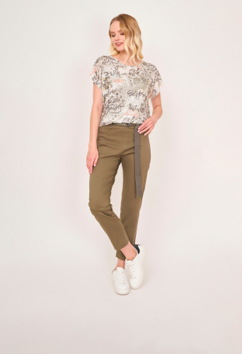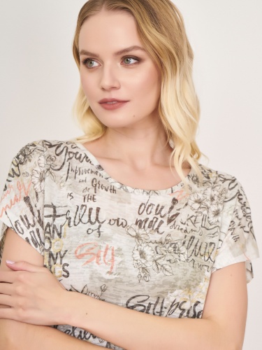 На сайте указаны российские размеры. Прямой трикотажный хаки джемпер-футболка с круглым вырезом, с коротким рукавом, с цветочным рисунком, с надписями. Длина по спинке: 64 см. Рост модели: 176 см.